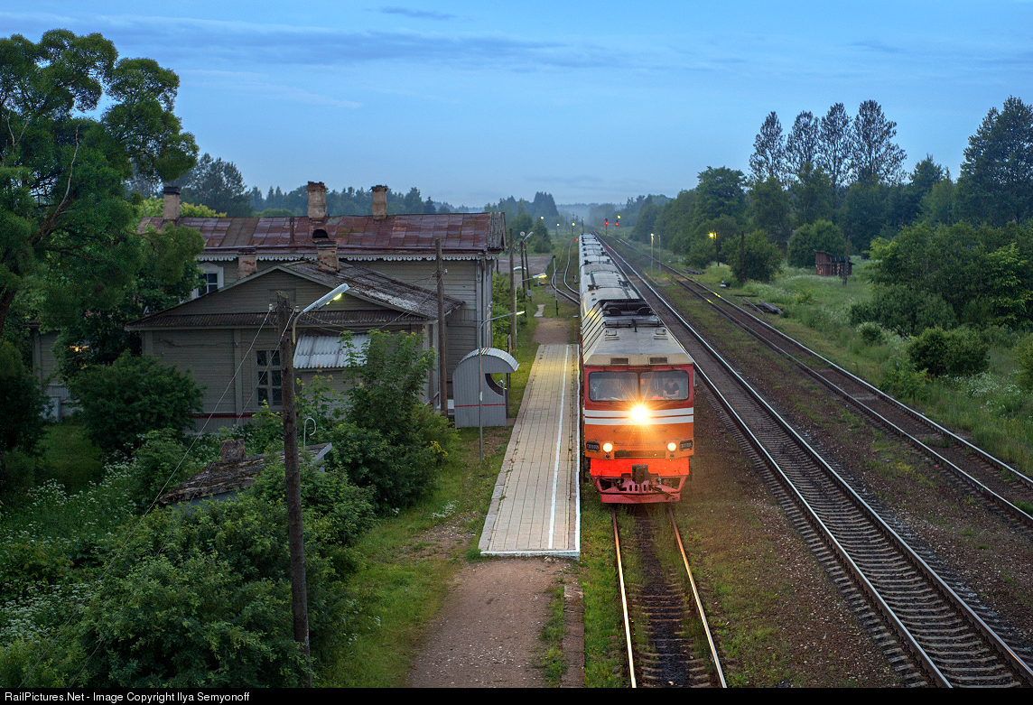 Backwoods of central Russia at the north of Tver region. Local time 3-30 AM. The train appears out of the twilight breaking the silence and tranquility. TEP70 locomotive with passenger train from St. Petersburg to Yaroslavl at Msta station on early morning...