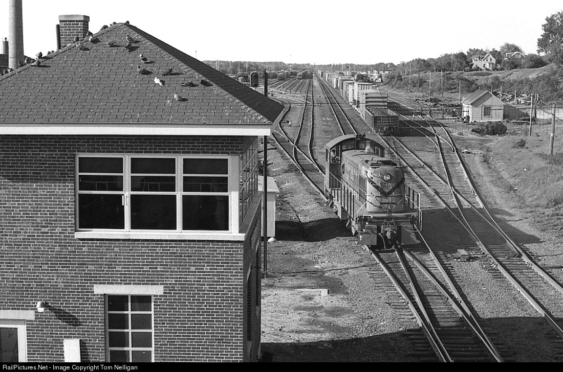 The resident pigeons have a great view of the action as Portland Terminal Company Alco S4 1062 works the north end of Rigby Yard in South Portland, ME. Tower PT presided over the Maine Central, Boston & Maine, and Portland Terminal action here.