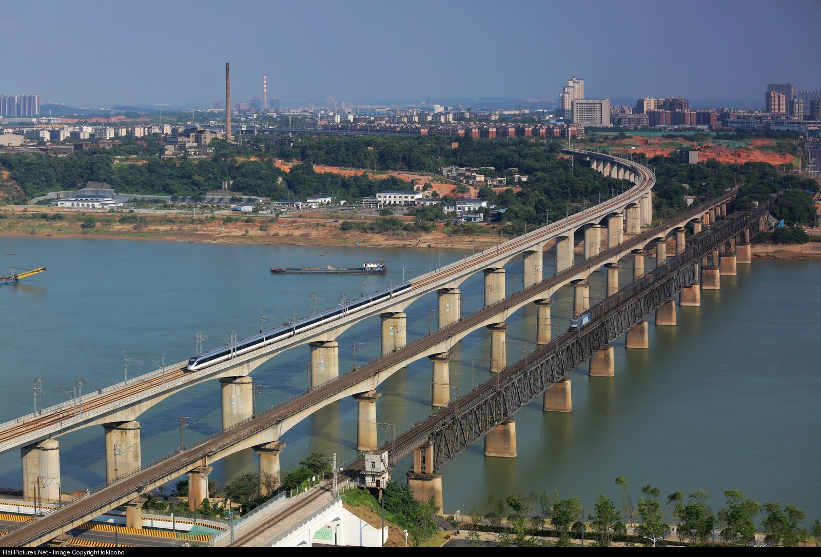 长株潭城际的CRH6F与沪昆铁路的货车一同驶过湘潭湘江特大桥上