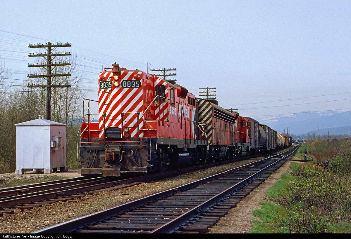 | CP 8835 heads the Sumas Turn out of Coquitlam Yard. The train will roll east to Mission City, then turn south to Huntingdon, BC where it will interchange with the BN at Sumas on the Washington state side of the border. It will then return to Coquitlam. This was the typical consist at the time. |