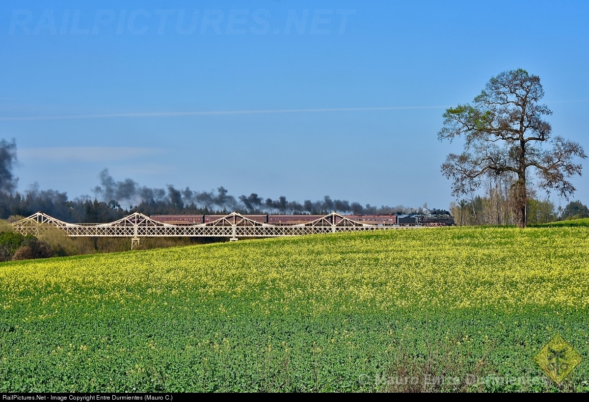 | "Tren de la Araucania" with mountain steam locomotive No. 820 built in 1940 in Philadelphia by Baldwin Locomotive Works, after crossing the massive Quino bridge in Victoria city, goes through the El Salto Bridge near Pua, in travel Victoria - Temuco. |