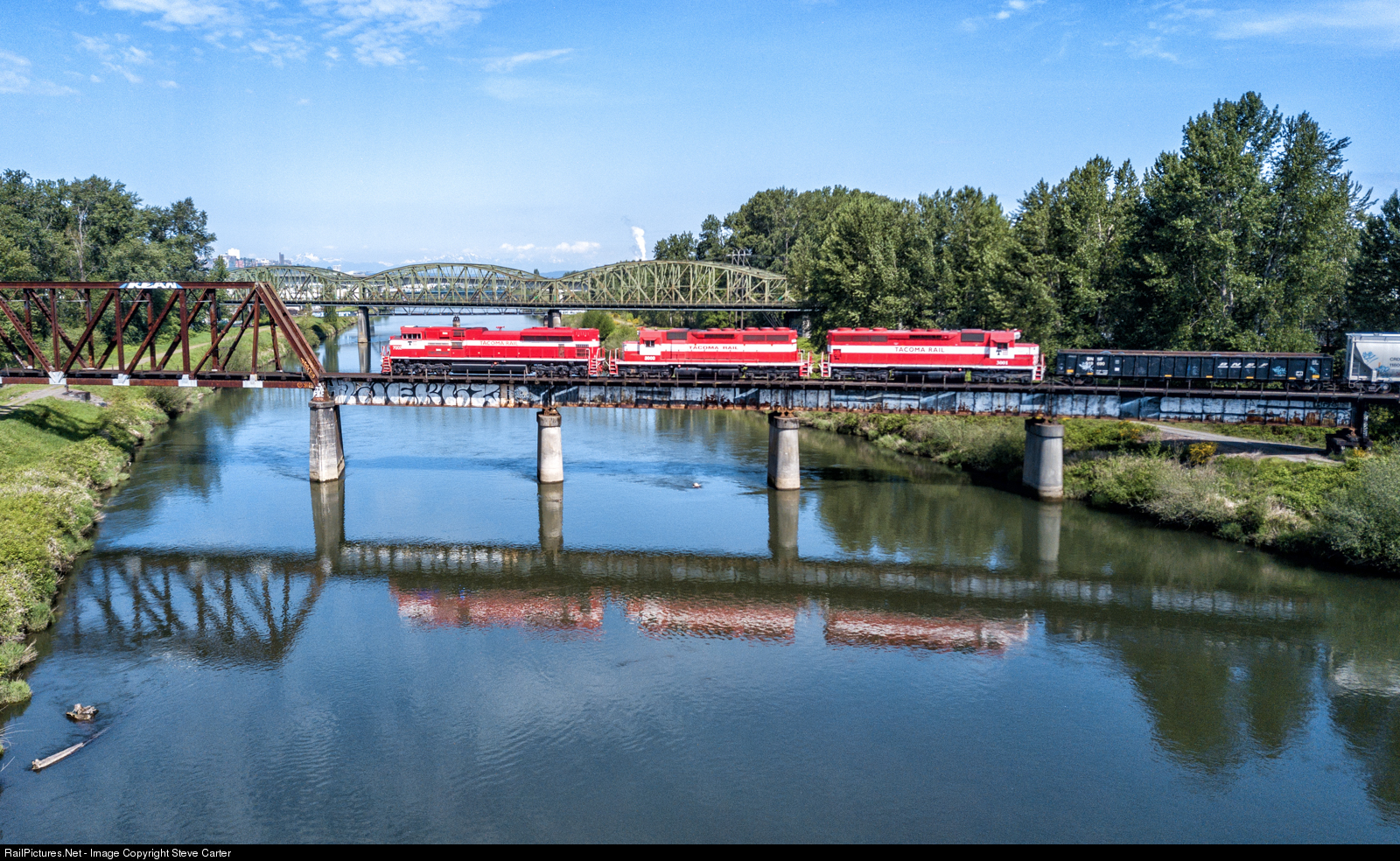 | Tacoma Rail's Hill job (101) begins it's journey to Frederickson. After shoving in to the UP's Fife yard, the train takes the short northern section of the Mountain Division over the Puyallup River on to a short run on the Sound Transit Lakewood Sub and then back on to the TR Mountain Division again. The bridge across the Puyallup and the trestle over the BNSF and UP lines were built by the Milwaukee Road. |