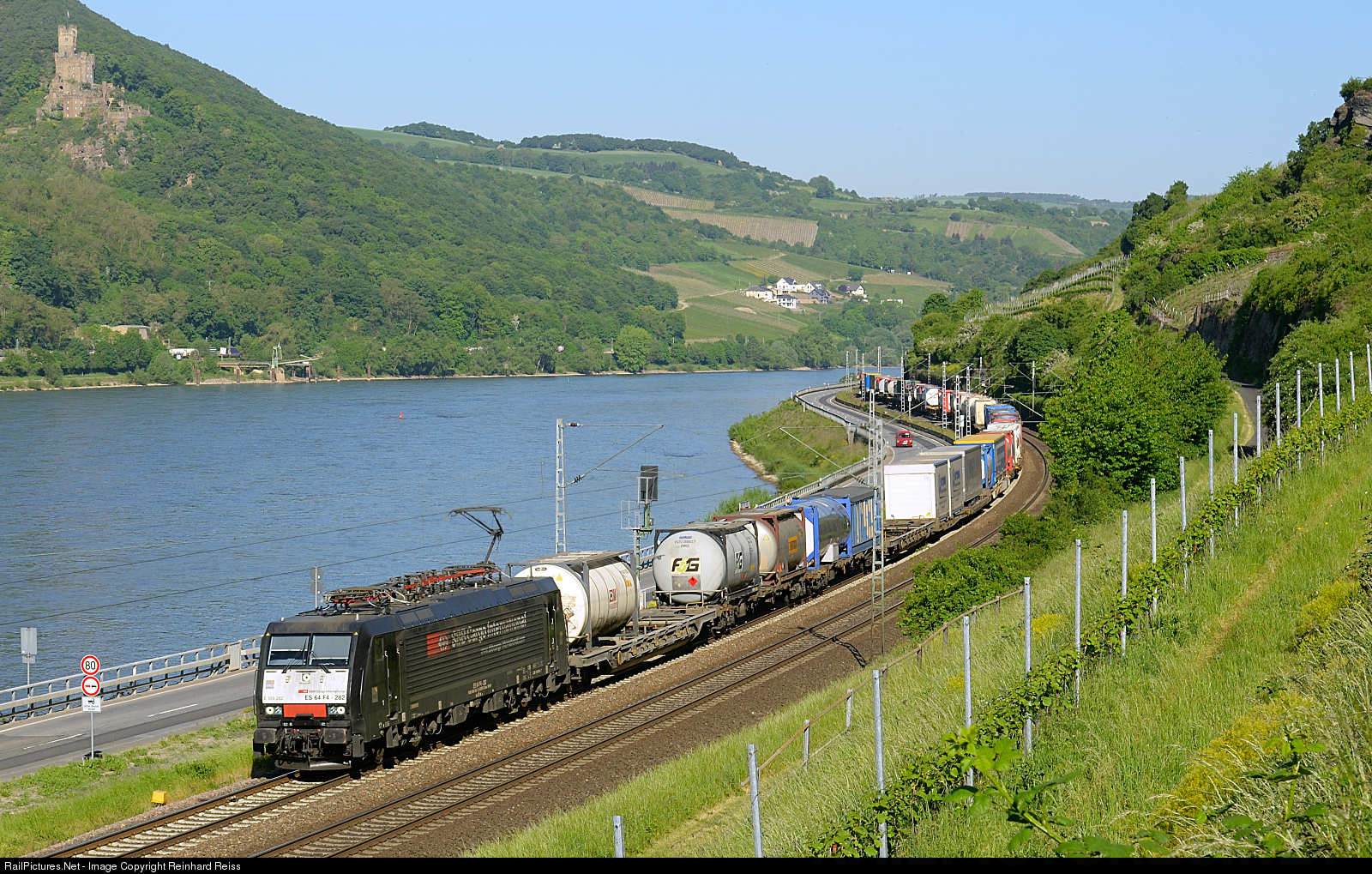 | 189 282 from SBB Cargo heads a southbound intermodal along the River Rhine. In the upper left corner Sooneck Castle can be seen. |