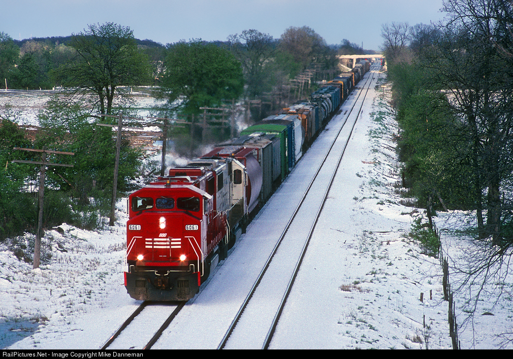 May 10, 1990, didn’t know what season to be in Wisconsin as green trees and grass try to emerge from beneath a good snowfall. Soo Line train No. 943 heads westbound at Pewaukee with new EMD SD60M No. 6061 on the former Milwaukee Road main line.