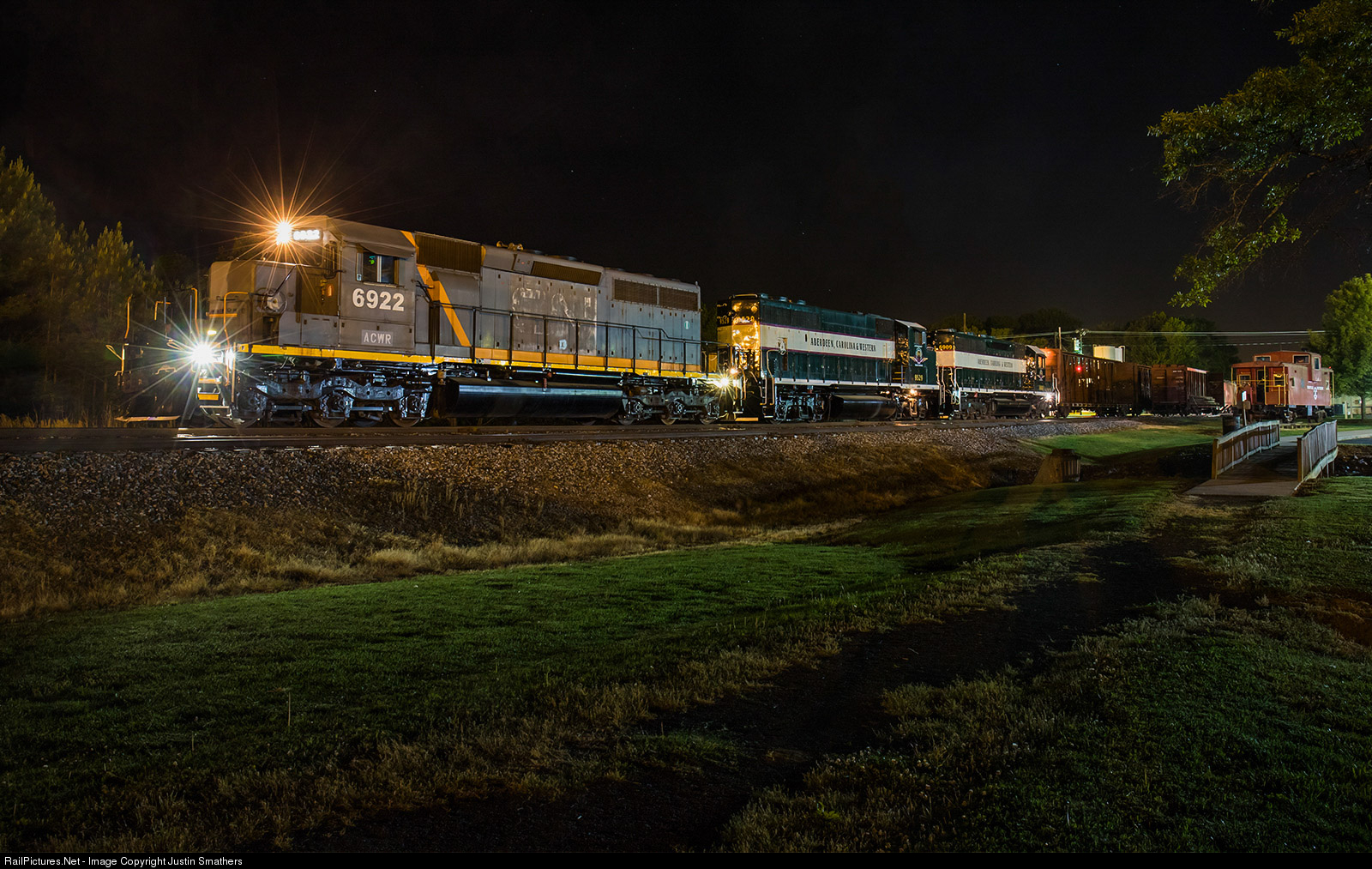 | After a slight mishap at Midland, the ACW 300 job finally arrives in Oakboro for a few quick switching moves. The crew has just coupled back to the train and in seconds they'll be blasting off toward Star. If it wasn't for the fact that the only active gray ACW SD40 and GP40-2W were on this train, there's no way we would've stayed out until the wee hours of the morning for this shot. Big thanks to engineer Seth for waiting a brief moment and dimming the headlights for a quick exposure shot! |