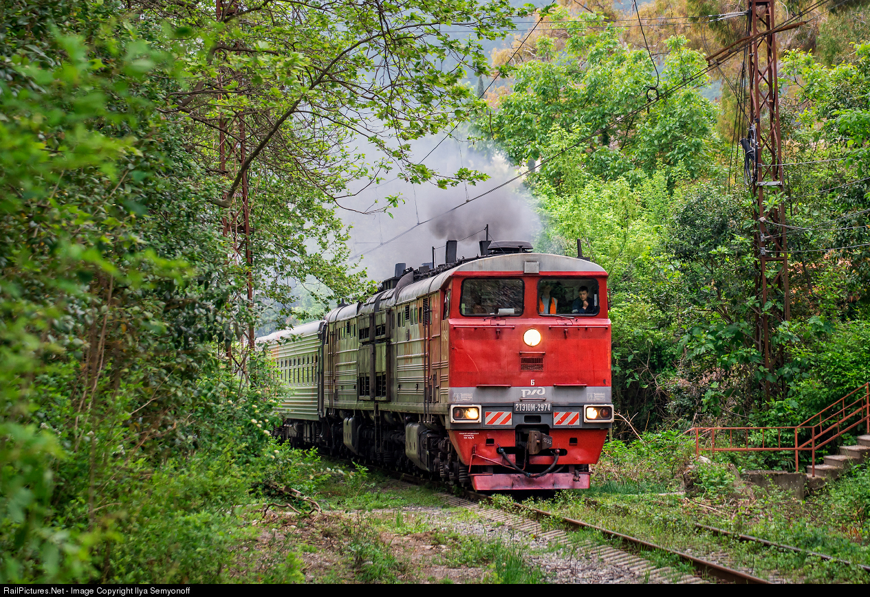 Passenger train from Moscow to Sukhum. The action take place in unrecognized republic of Abkhazia, a disputed territory on the eastern coast of the Black Sea and the south-western flank of the Caucasus. The status of Abkhazia is a central issue of the Georgian–Abkhazian conflict. The wider region formed part of the Soviet Union until 1991. Abkhazia was severely damaged during the conflict. Many infrastructure objects were destroyed. Devastation came in cities and settlements. Only in recent years country begins to slowly recover. In 2011 Russians repaired railroad infrastructure: cleared the road from vegetation and garbage, laid concrete sleepers, reconstructed traction substation, restored permanent electricity. There were frequent problems with the electricity in Abkhazia until 2011, so trains had been caried by diesel locomotives.