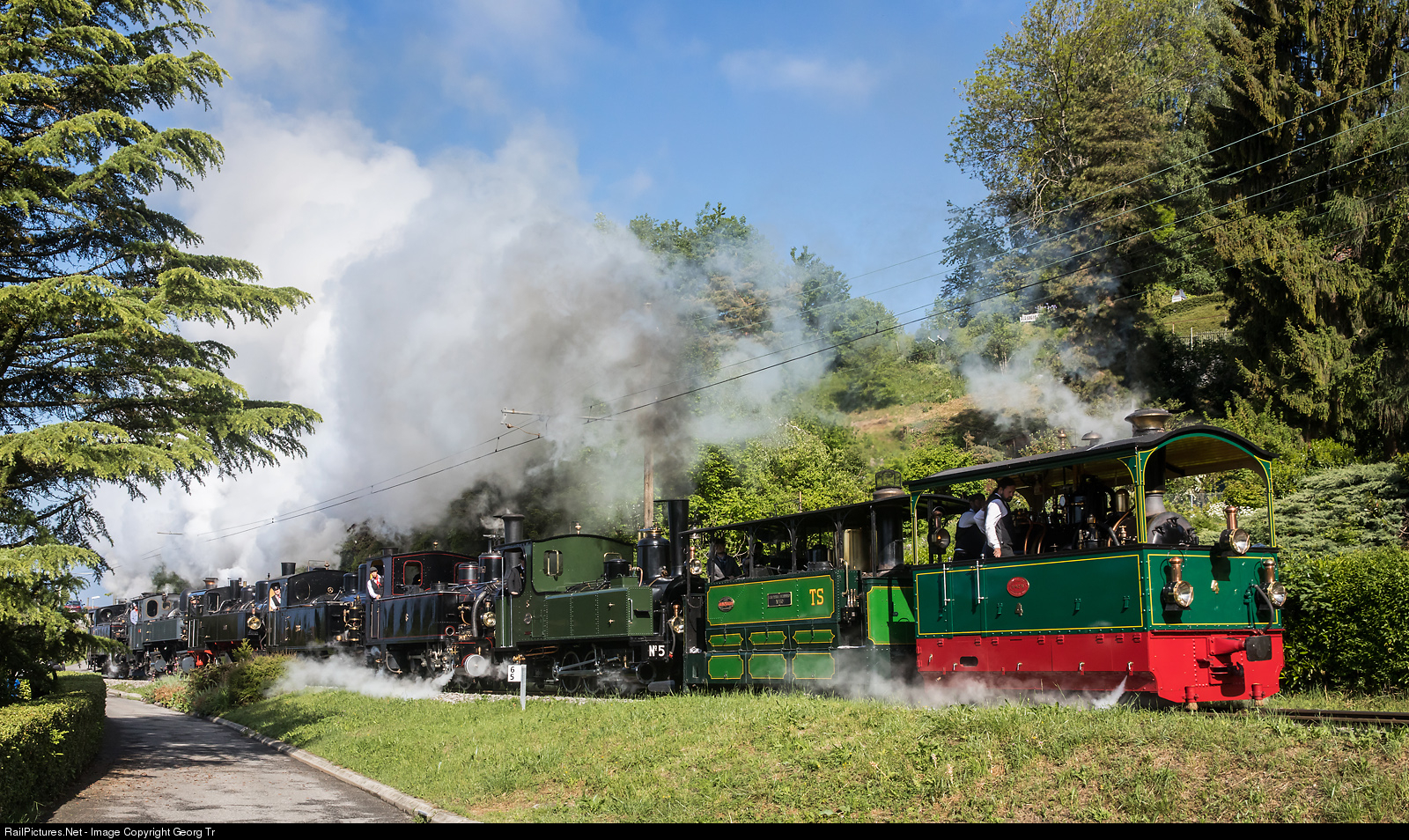 In 2018, the Blonay-Chamby Railroad/Museum is celebrating 50 years of operation. On this day, for photographers and filmers there was organized a "Mega Steam Festival" with 10 one meter gauge steamlocomotives. In this consist are 4 locos owned by the Blonay-Chamby and 4 others as guests: Form right to left: Tramway locomotive G 2/2 # 4 "Rimini" from 1900 (BC), tramway locomotive G 3/3 # 60 of Tramway de la Sarte from 1898 (guest), G 3/3 # ex LEB from 1890 (BC), G 3/3 # 6 ex BAM from 1901 (BC), G 3/4 # 208 of the Ballenberg Dampfbahn from 1901 (guest), G 2x2/2 Mallet # 105 ex Zell-Todtnau from 1918 (BC), G 2x2/2 Mallet E # 164 of La Traction from 1905 (guest), HG 3/4 # 4 of the Dampfbahn Furka Bergstrecke from 1913 (guest).