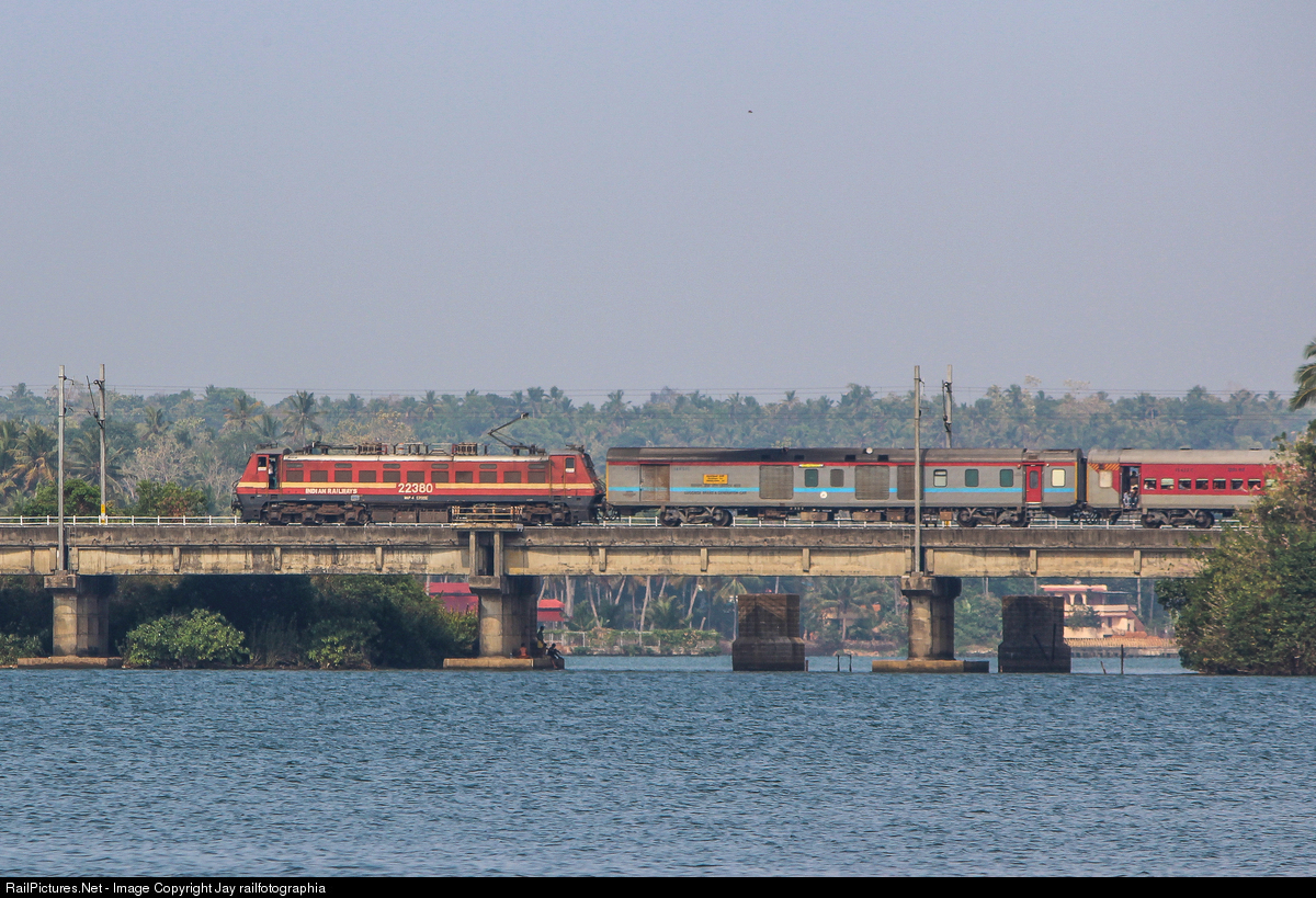 With shut down generator car behind the loco, as the rear one was powering the carriages, crossing Kilimukkam lake with ERODE WAP-4
