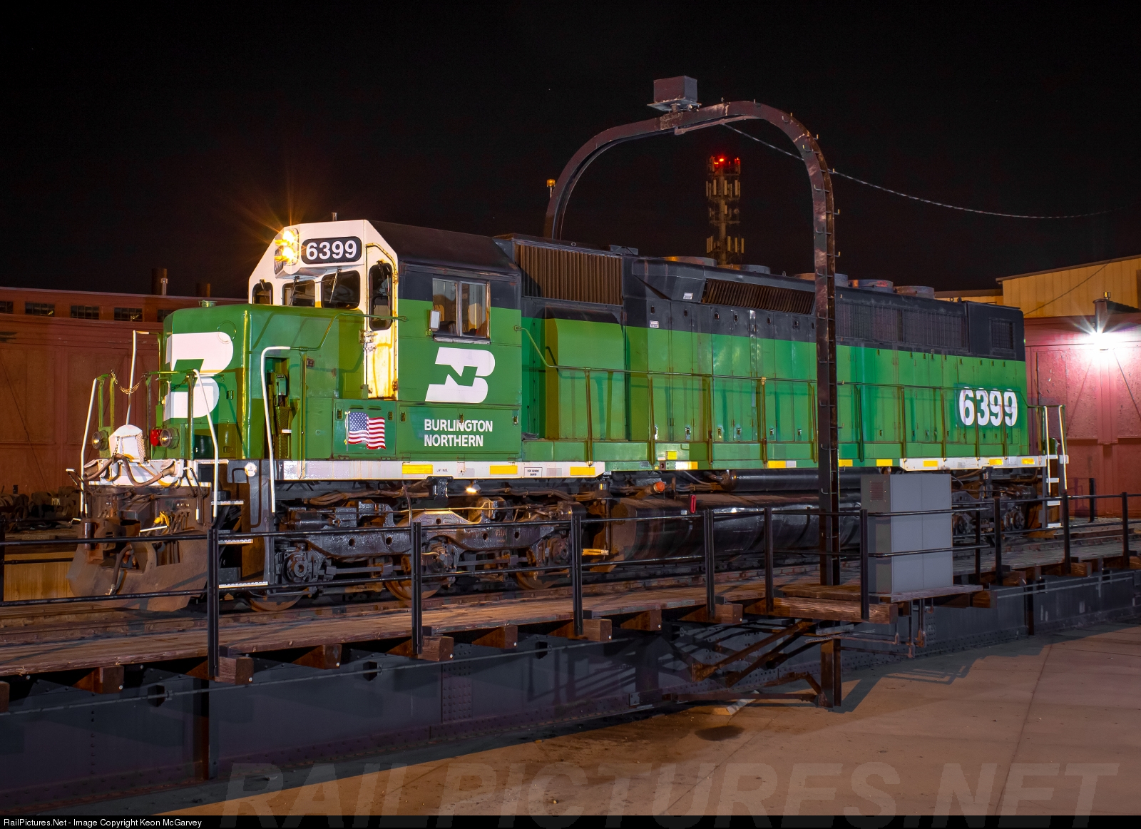 | Minnesota Transportation Museum's former Great Northern SDP40 #325 sits on the turntable of the Jackson Street Roundhouse. The locomotive was temporarily patched as its old self, BN 6399. The unit was featured as it will (hopefully) be repainted into Great Northern colors in 2019. |