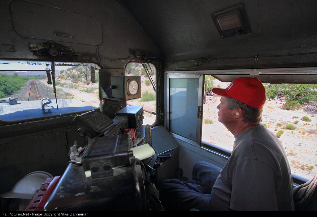 Engineer Kenny Burgess is at the throttle of Copper Basin Railway EMD GP39 No. 505 on an OT-1 ore train near Kearrny, Arizona, headed for loading at at Ray Mine on April 20, 2017