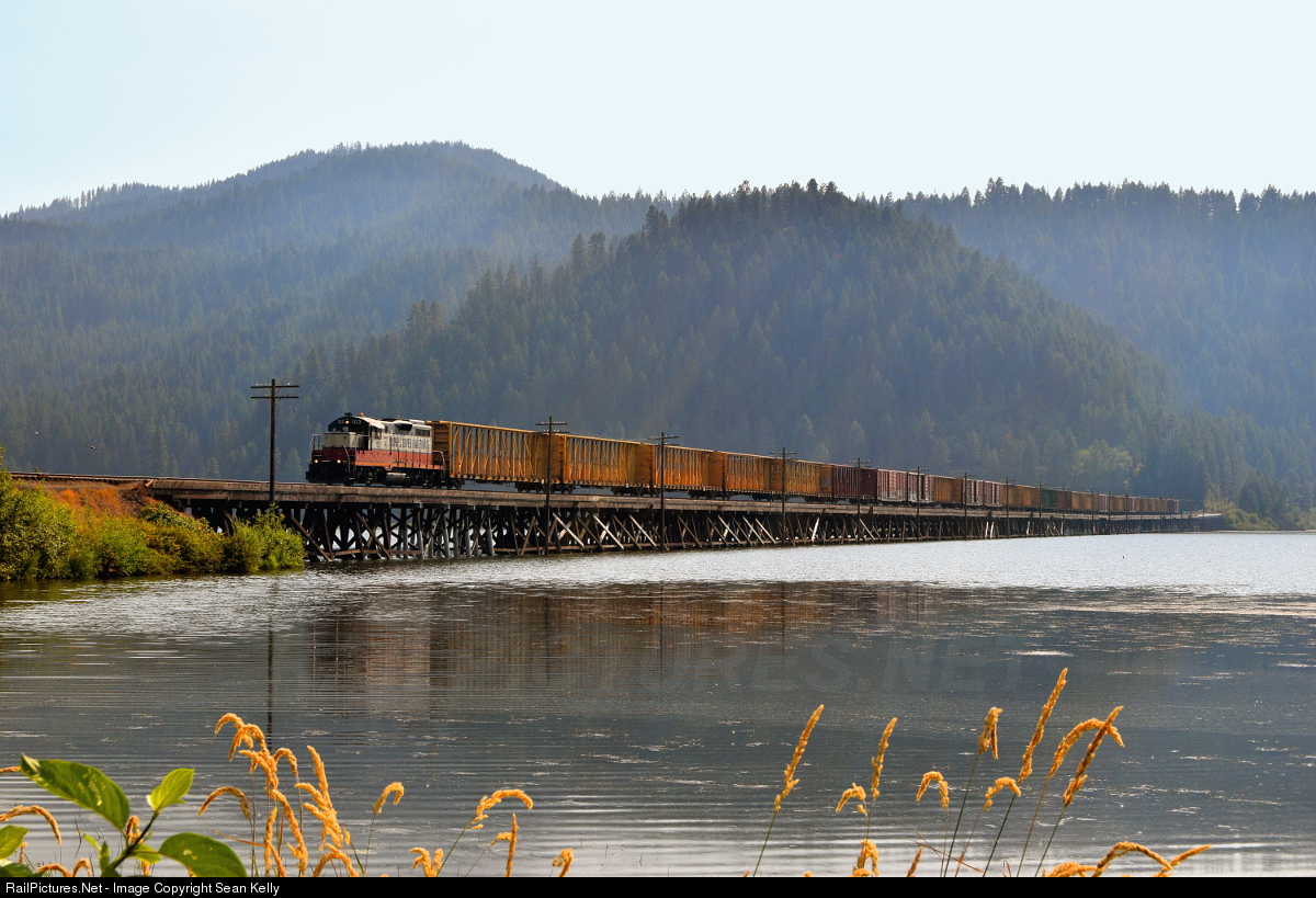 While driving through the tiny town of Plummer, Idaho today, I noticed that the St. Maries River Railroad's Switcher was in town, but that Union Pacific's Plummer Turn had not arrived yet (the two trains exchange cars in Plummer before returning to their points of origin). With the exchange being a tad later than normal, and with an unusually long train for the return trip to St. Maries, I decided to drive down to the trestle over Benewah Lake in Heyburn State Park. Beneath a sky filled with smoke from wildfires all across the Northwest, a single ex-Milwaukee Road GP9 gingerly eases a 27 car train of empty lumber cars off the bottom of the 1% downgrade that this train has been slowly descending for the past hour and across the trestle. This bridge is on the former Milwaukee Road main line, where there were once several freight trains and passenger trains per day, including the famous "Olympian Hiawatha" streamliner.