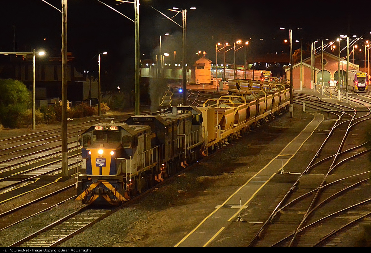 | Roaring through the city of Bendigo, Qube's up ballast train from Rochester 9070 is powered by three vintage Victorian Railways T class locomotives T373, T395 & T376. This is part of a ballasting program that Qube are undertaking for PTV where they will eventually drop ballast in the Melbourne Metro network. |