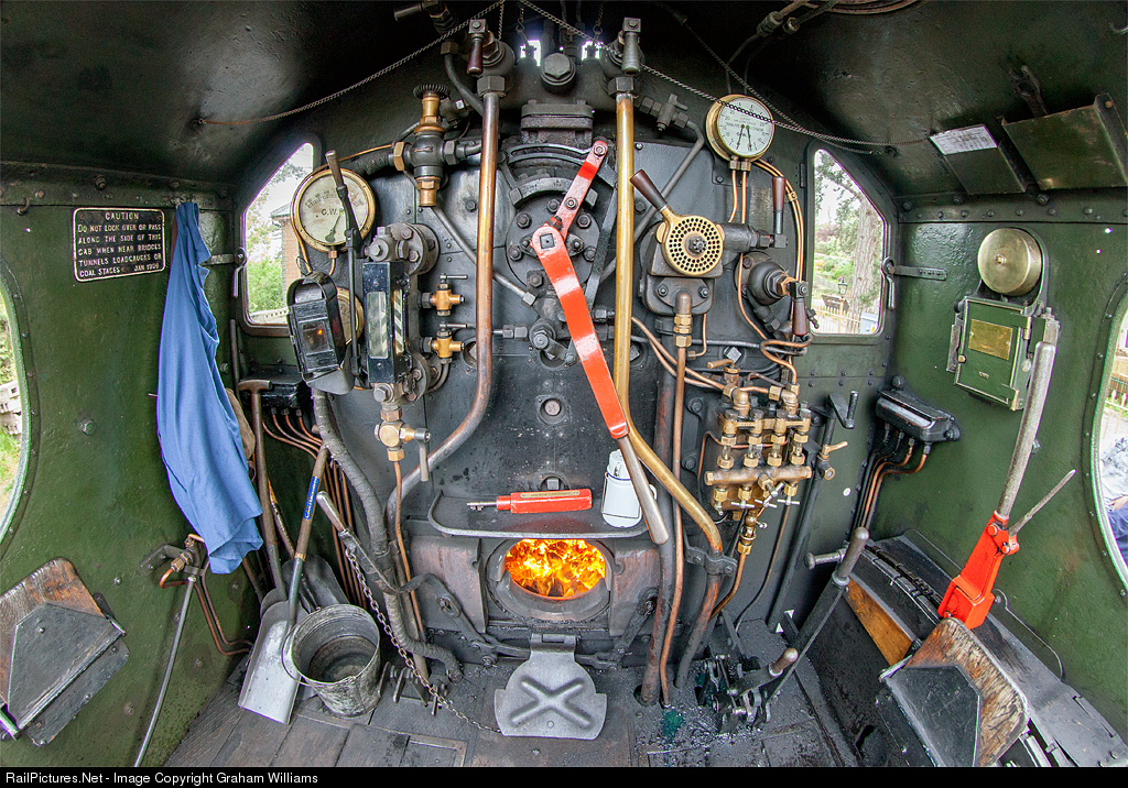 A view inside the cab of GWR Churchward 2-8-0 no 2807 at Broadway on the Gloucester and Warwickshire Railway on its newly opened extension.