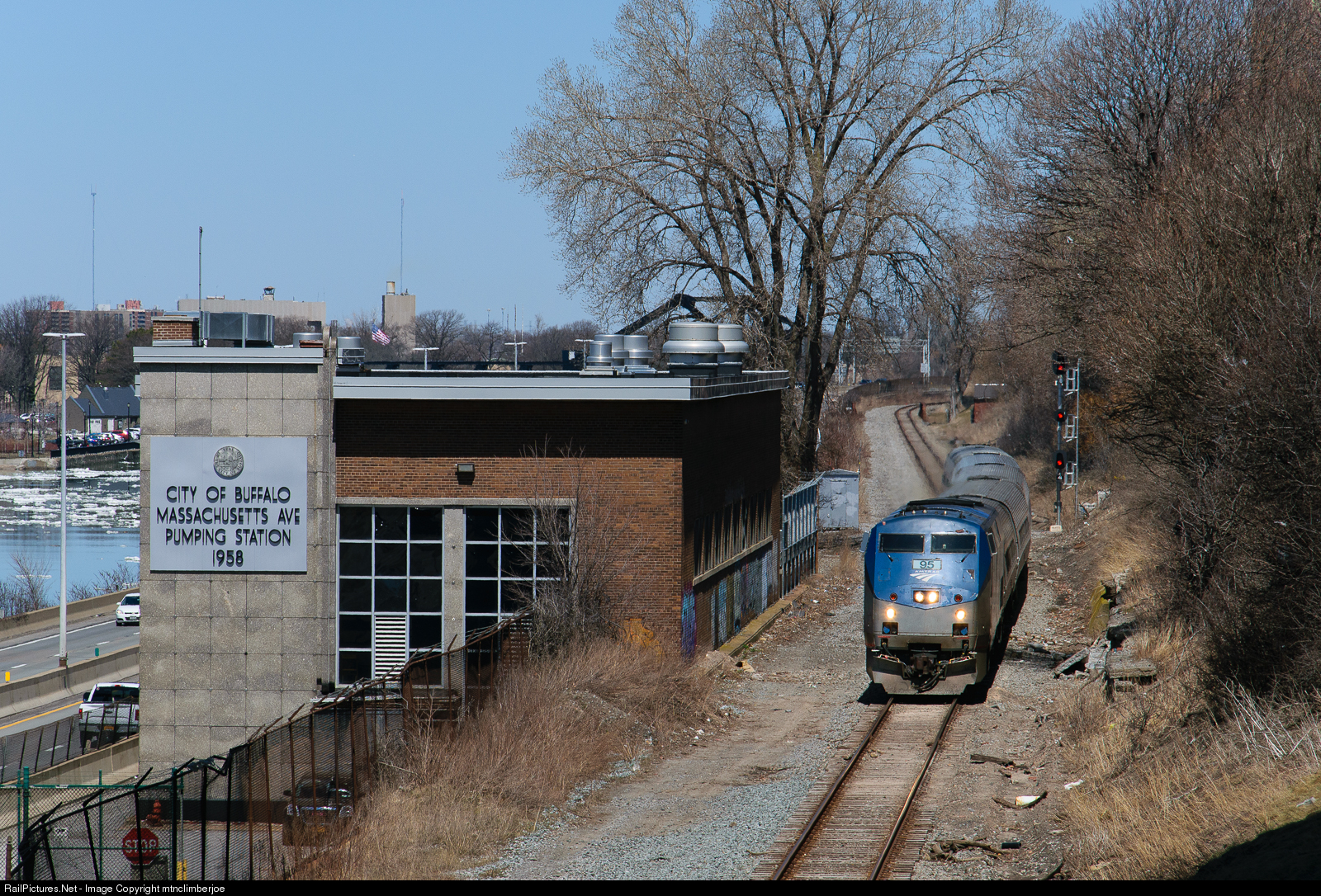 Amtrak's Maple Leaf heads south along the Black Rock Canal and I-190, passing a pumping station for the City of Buffalo.