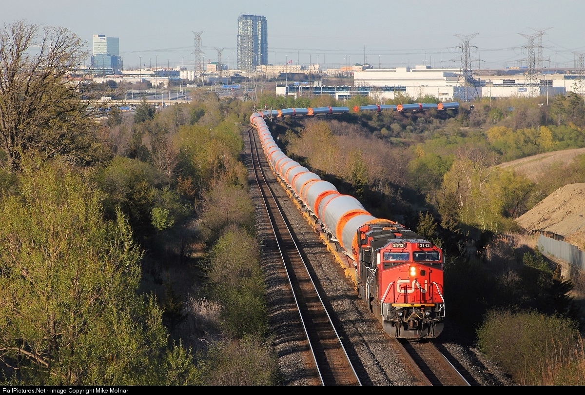 | On a warm Sunday afternoon a loaded wind turbine tower train re-enters double track after crossing a single track bridge at CP Humber on the Halton Subdivision. Vaughan, Ontario is part of the Greater Toronto Area and is just north of Toronto along the 407 which is visible in the top left portion of the photo. CN's massive Macmillan Yard, the largest yard in Canada, is just east of this location as well. |