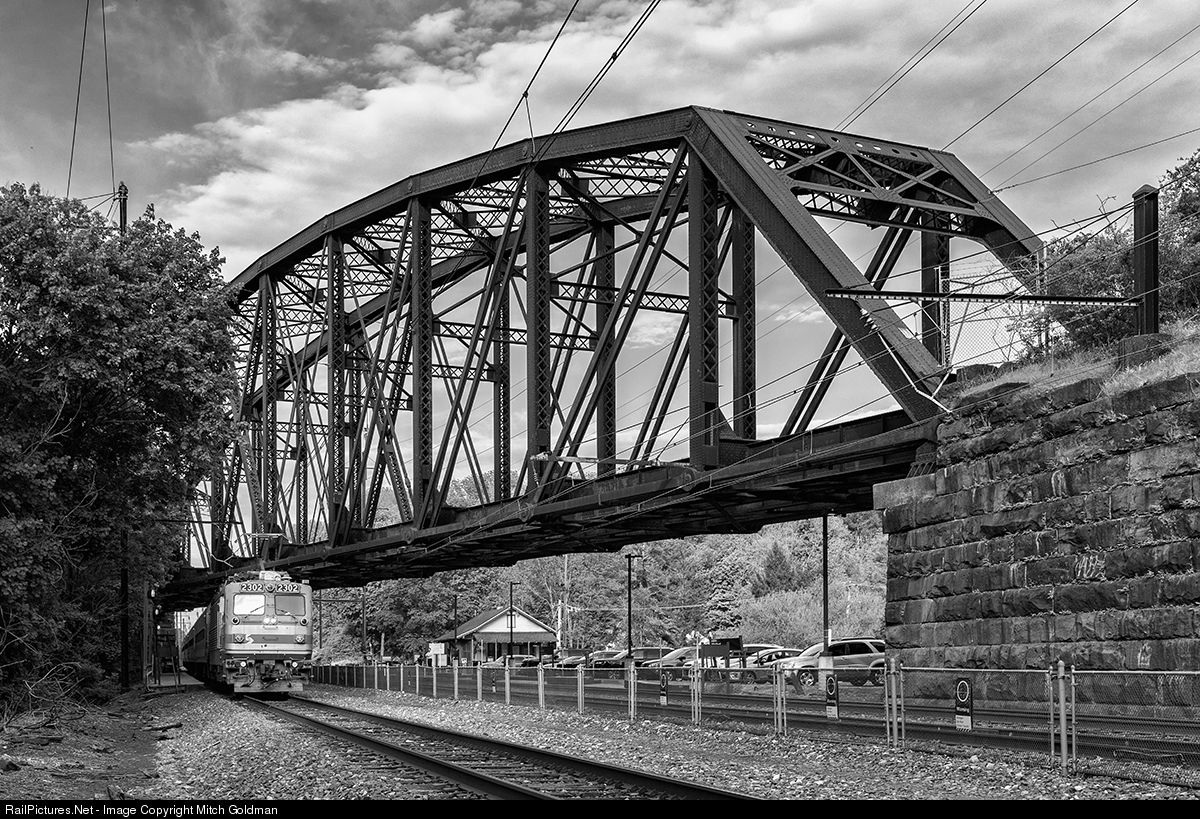 | A westbouind SEPTA push-pull set led by AEM-7 No. 2302 arrives at Whitford station, coming to a stop underneath the massive 1906 built pin-connected Parker through truss bridge. Built for the PRR, the 375 foot bridge was part of a bypass known as the P&T (the Philadelphia and Thorndale Branch) which paralleled the main line between Frazer and Thorndale. Sadley, it was abandoned by Conrail in 1989. |