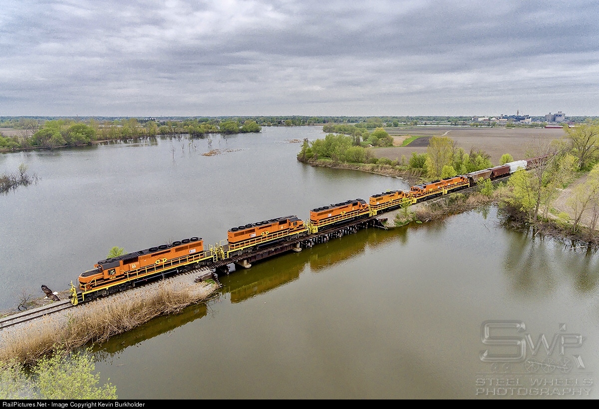 What started out as what would normally be a standard flight for a photo, turned into an adventure with interesting results. Having lost one UAV two years ago within a mile of this location to a bald eagle attack in flight, my guard is always up for the big birds. As Huron & Eastern train 702 approaches Dutch Creek, south of Bay City, MI, I sent the UAV up and out to get a shot. I was about 40 feet AGL and had gotten into position with about 2 min to spare. As I fine tuned my angle, something caught my eye and a black flash obscured the screen. I looked up and holy explorative, an eagle had arrived and was making a circle back. I quickly took to a higher elevation to gain some maneuverability. At the same time the train was rolling into the low Trestle and a second eagle was sailing into my viewfinder! I quickly snapped a shot as I tried to out maneuver those anti-UAV bald eagles. I landed a shot of a lifetime, hurriedly and nearly accidentally as I was exiting. I did get some nice regular camera pics of one of the birds following my P4P back to me. A change of drawers required, but it appears that the second eagle photobombed my 6-Unit, 3-railroad image. MQT 3390/3391, HESR 3485, 2028, and ISRR 3044/3045 lead the 702 train from Bay City to Durand, MI. The UAV survived this day...but thoughts of one of my older P4s at the bottom of the Saginaw River rang loudly in my head.