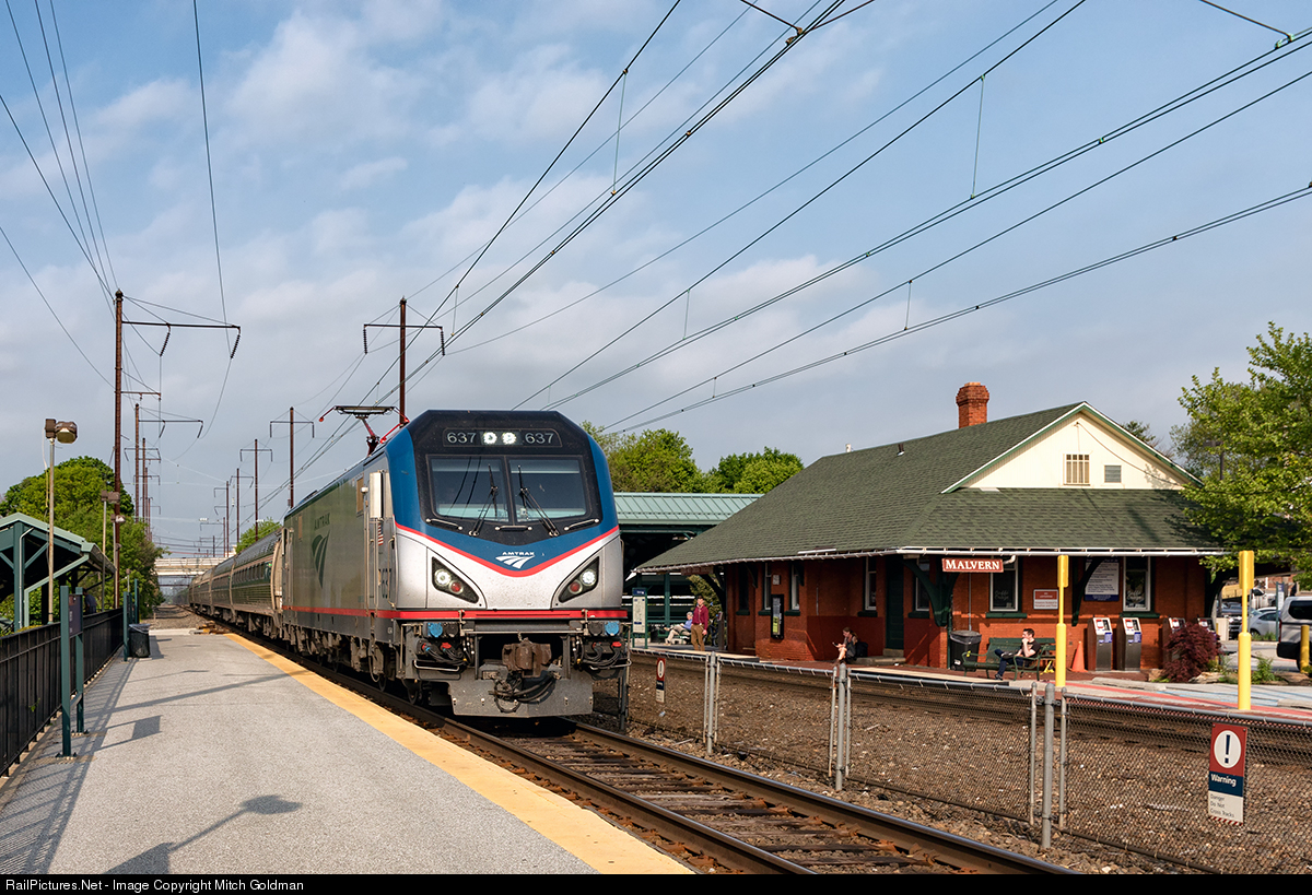 A late afternoon Amtrak Keystone train sprints west through Malvern, PA, with ACS-64 No. 637 on the point. The station, to the right, was built by the PRR railroad in 1900 and remains in service today. Until 1998, some Amtrak Keystone trains stopped here as well. The station is roughly 22 miles west of Philadelphia.