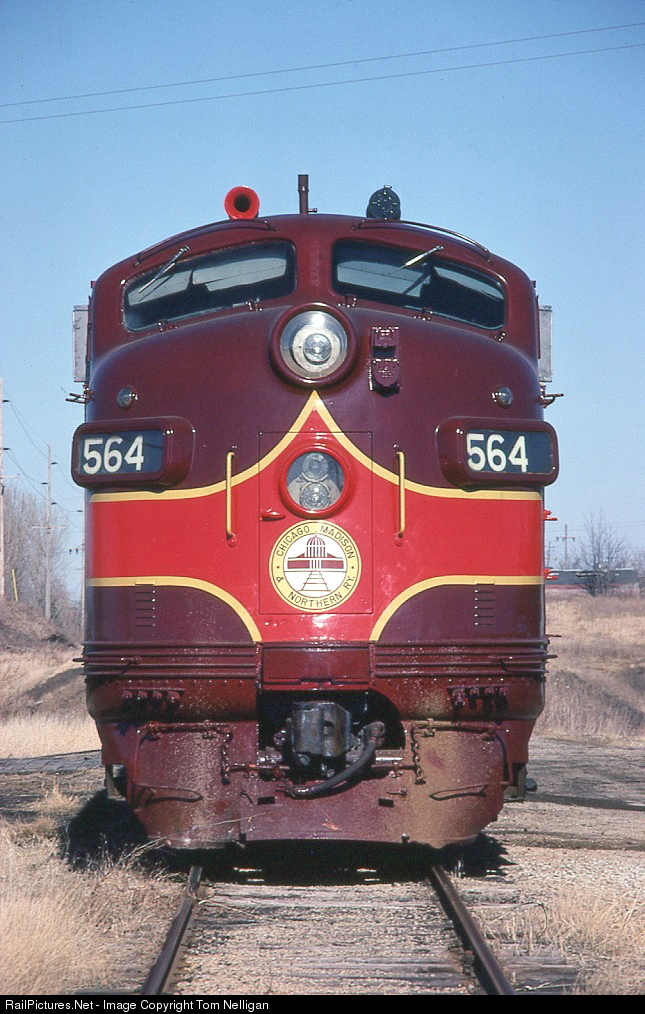 The Chicago, Madison & Northern was a short-lived (1980-82) railroad that operated former Illinois Central and Milwaukee Road branchline trackage in southern Wisconsin. The star of the CM&N's diesel roster was F7 564, a former Rio Grande unit, which posed in its fresh paint during a weekend layover at Monroe, WI.