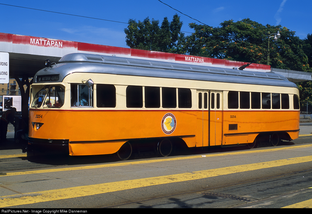Massachusetts Bay Transportation Authority (MBTA) PCC streetcar No. 3254 has just arrived at Mattapan station on September 12, 2003. This car was built by Pullman-Standard in 1946 for the Boston Elevated Railway. A roster of vintage vintage PCC streetcars still operate on the 2.6-mile Ashmont to Mattapan “High Speed Line.”