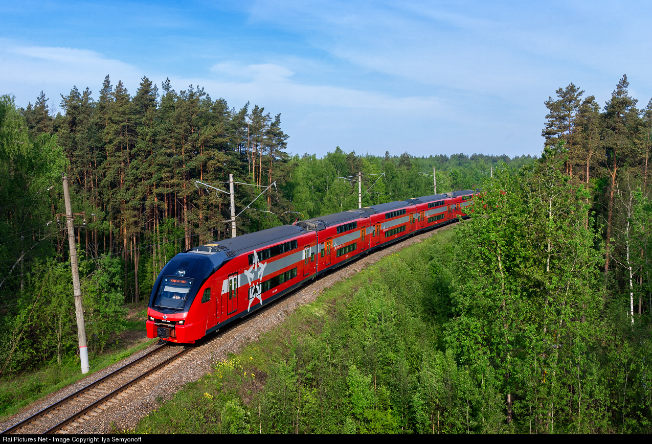 "ESh2" Electric hight speed train "Stadler Kiss" goes from Moscow to DME airport. "ESh2 Eurasia" is the name of the "Stadler KISS" double-deck high speed electric express trains. These trains are used by 3 operators: Aeroexpress on Russian Railways, Azerbaijan Railways and Georgian Railways.
