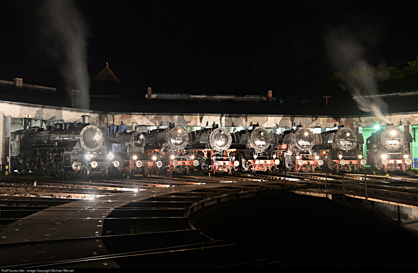 Saturday evening at steam Event "Fünf Tage Dampf im Ries" (Five days steam in the Nördlinger Ries). Most of the Museum's steam locomotives are presented in front of the locomotive shed