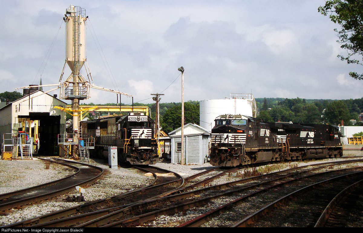 | To help trains traverse the steep grades between Altoona and Cresson, helper engines are added to the front and back ends of trains. Here is one such helper NS 6310 resting and refueling at the Cresson Engine House. |