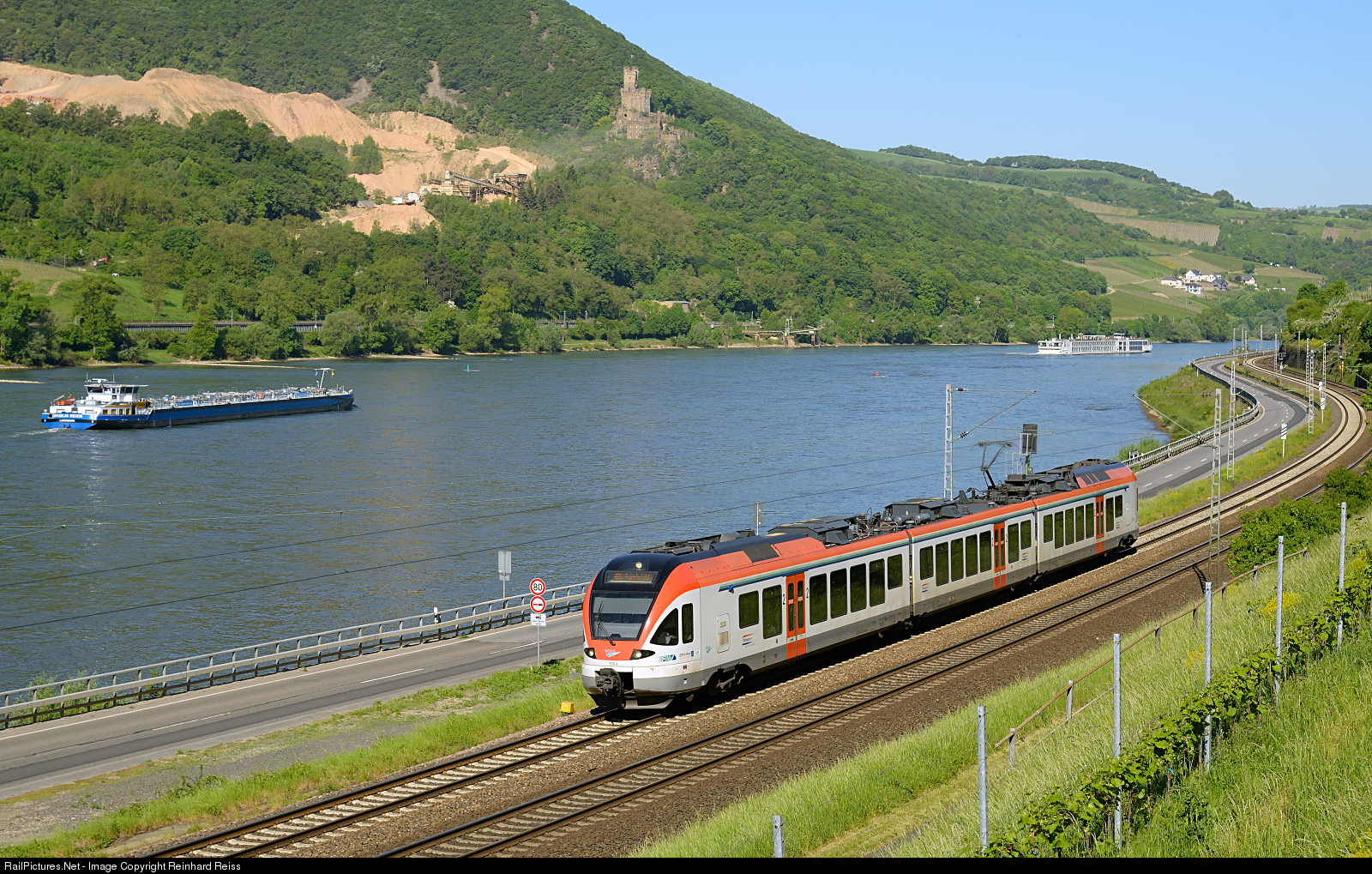 VIAS-Flirt 302 (427 150/650) passes Sooneck Castle at the opposite bank of the River Rhine on the way from Neuwied to Frankfurt.
