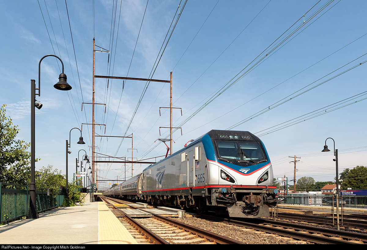 | A low angle perspective of an Amtrak Regional Express led by AMTK No. 665 northbound through Croydon station in Pennsylvania. A different "take" from Croydon - one that inclusion of the station was a welcome reminder after a one year delay in posting. |