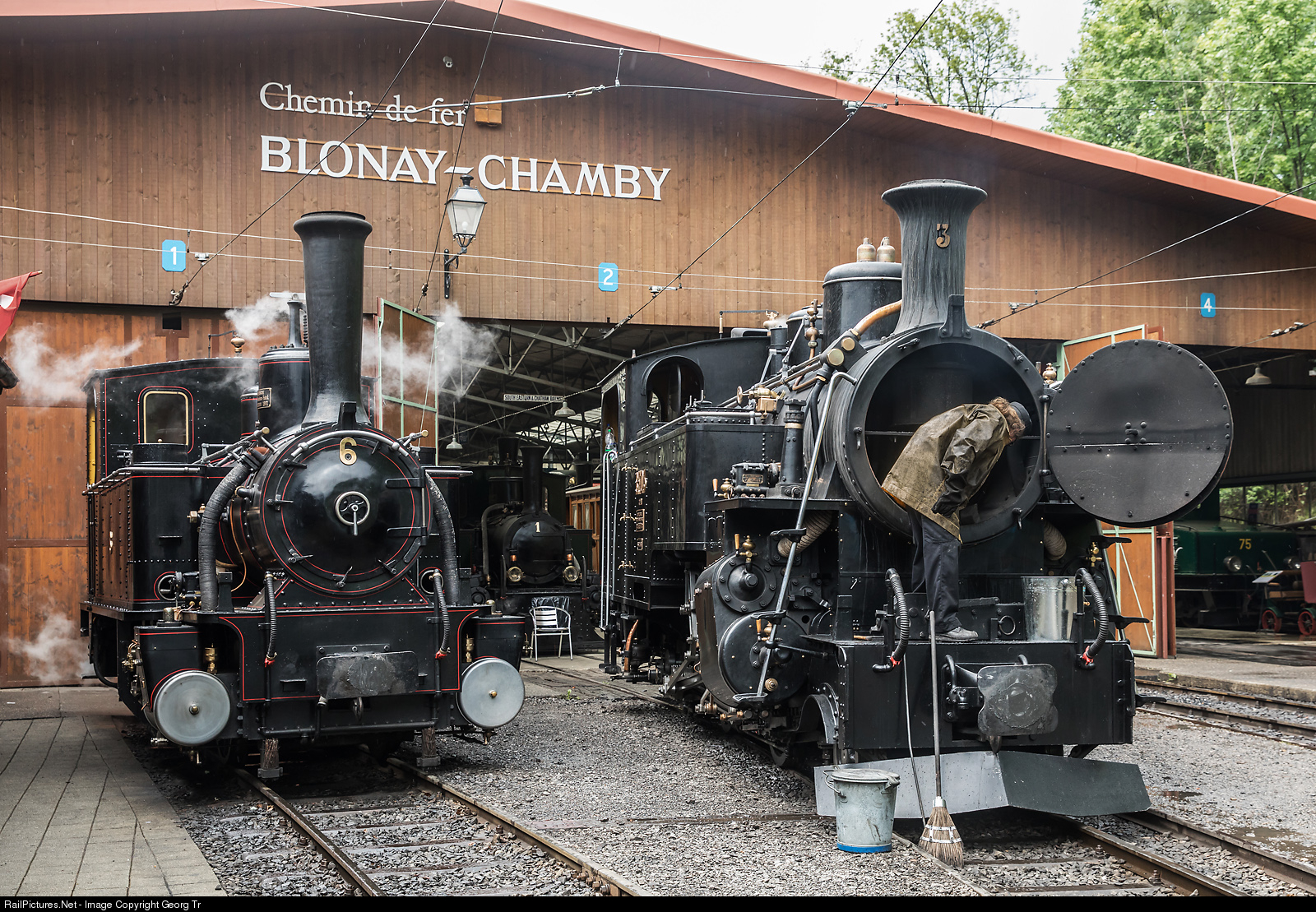 The Blonay-Chamby Railroad Museum is celebrating 50 years of service, it was the first museum railway of Switzerland. In front of the shed at Chaulin museum are standing the G 3/3 # 6 of the former Bière-Apples-Morges (BAM) and the cogwheel locomotive HG 3/4 # 3 of the former Furka-Oberalp-Bahn (FO). A scene during the MEGA STEAM festival of the Blonay-Chamby on the pentecost weekend.