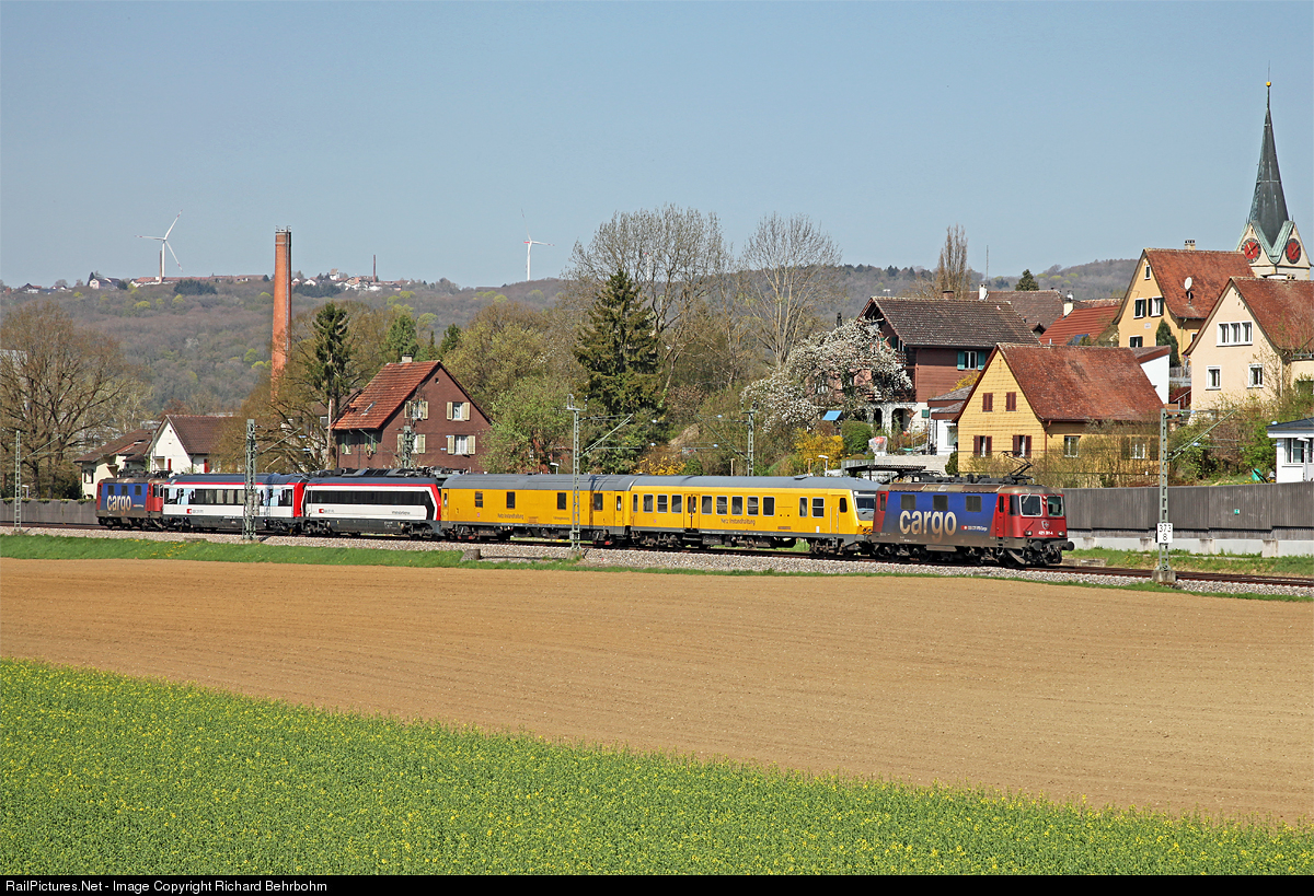 | A push-pull mixed German/Swiss measuring track train with SBB-Cargo locomotives at the end of the train. The yellow cars are owned by Deutsche Bahn, the SBB one are white colored. |