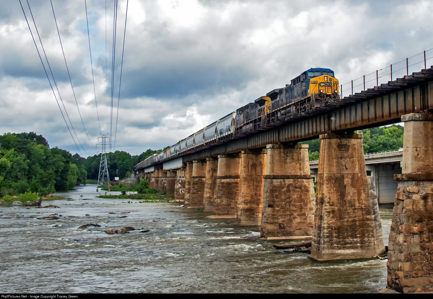 The Elusive Shot (for me). This is Q211 on today's version of its daily run over the CN&L Bridge into Columbia, SC. I have wanted to catch this shot for over two years, but the timing hasn't worked out for one reason or another. Today, when I heard over the scanner that Q211 was leaving Slighs, SC, I thought I would have sufficient time to get to Riverfront Park from my home and catch it. Riverfront Park is about 15 minutes from my home, plus about a 10-12 minute walk to the photo location; Slighs is milepost 30.0 and this is close to milepost .8. I moved fairly purposely, though I didn't rush, and drove down to Riverfront Park, got my camera bag and backpack, hooked up the scanner, and started walking. About five minutes from my intended photo spot (on a steady walk), the scanner came on and dispatch asked where Q211 was at; the response was the C 3.0, about 2 miles away from the photo location. So I took off running at a very fast clip and made it just in time to catch the shot.