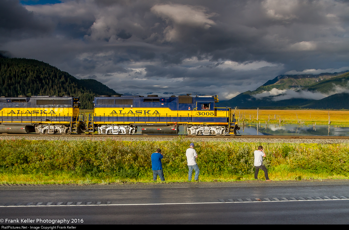 | Visitors, although I rarely see anybody out taking photos during the non-tourist part of the year, there are plenty of visitors during the summer months. At some point most of the Railfan visitors manage to make contact with me either before they arrive or once they get here. Three visitors are enjoying some nice storm light as a Whittier bound freight rolls by their location. |