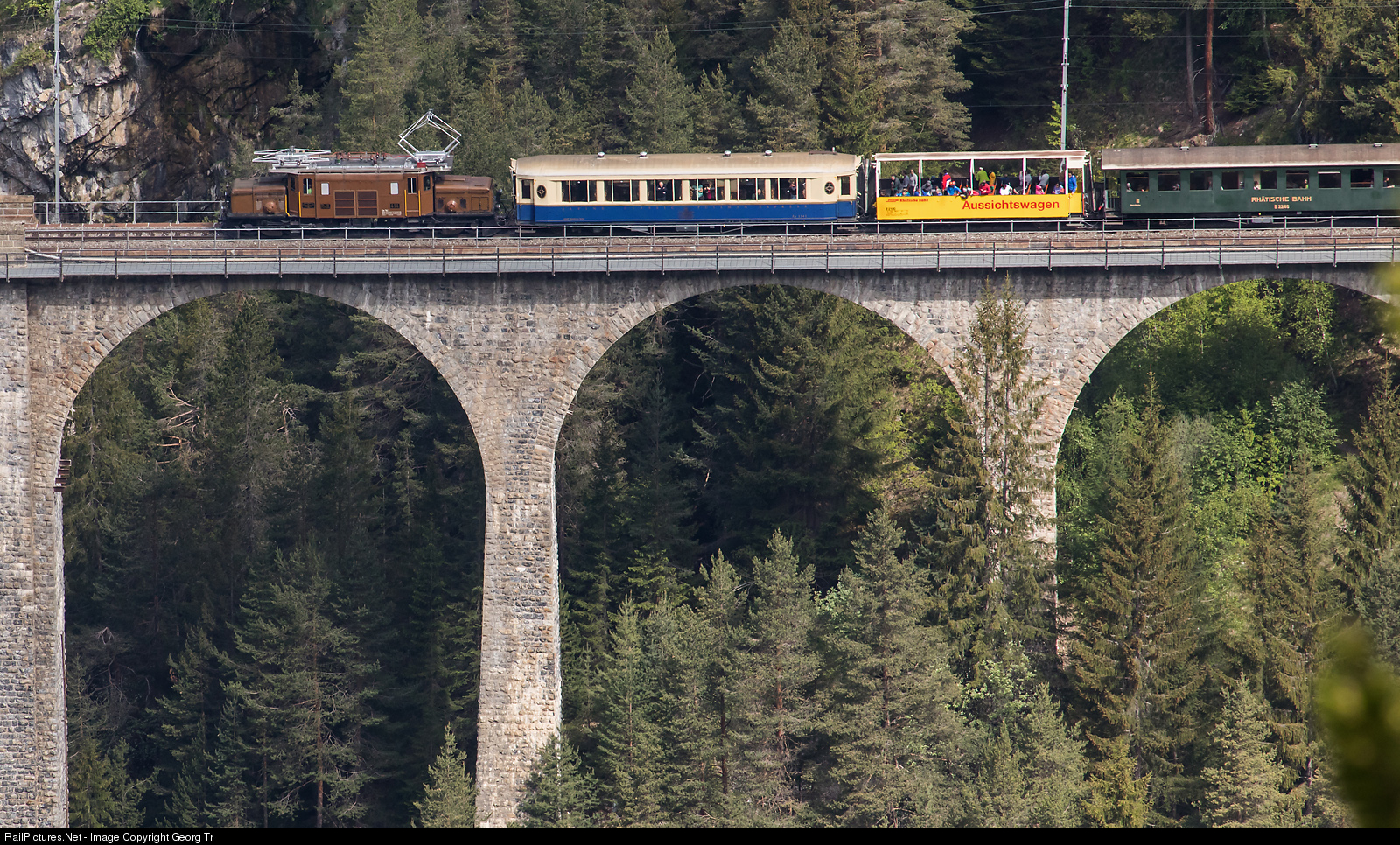 Timetabled historic train of the RhB with "Crocodile" or "C-C" Ge 6/6 I # 414 is crossing the 89 meter high and 210 meter long Wiesener viaduct. It was built from 1906 to 1909 and is part of the line from Filisur to Davos Platz through the Zügen gorge. This train is running daily two times from Davos to Filisur and back till october 28th, replacing the usual modern trains and useable with all tickets without supplement. The Ge 6/6 I is pulling first class parlor car As # 1141, open observation B # 2100, second class B # 2246, dining car B # 2138 "Filisurer Stübli" and covered freight car K # 5615. The line has more then a dozen tunnels, the longest over 900 meter, so in the open observation car you can enjoy a real ghost train feeling.
