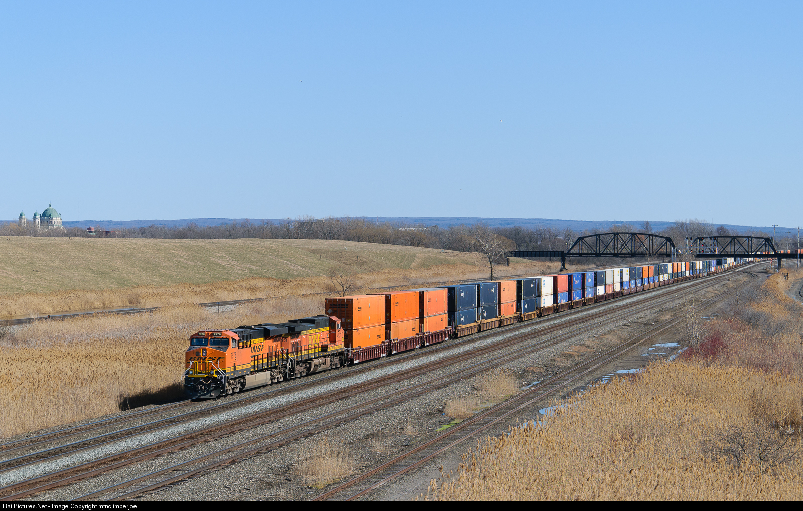 A pair of BNSF locomotives lead an eastbound CSX intermodal train as it comes into Buffalo.