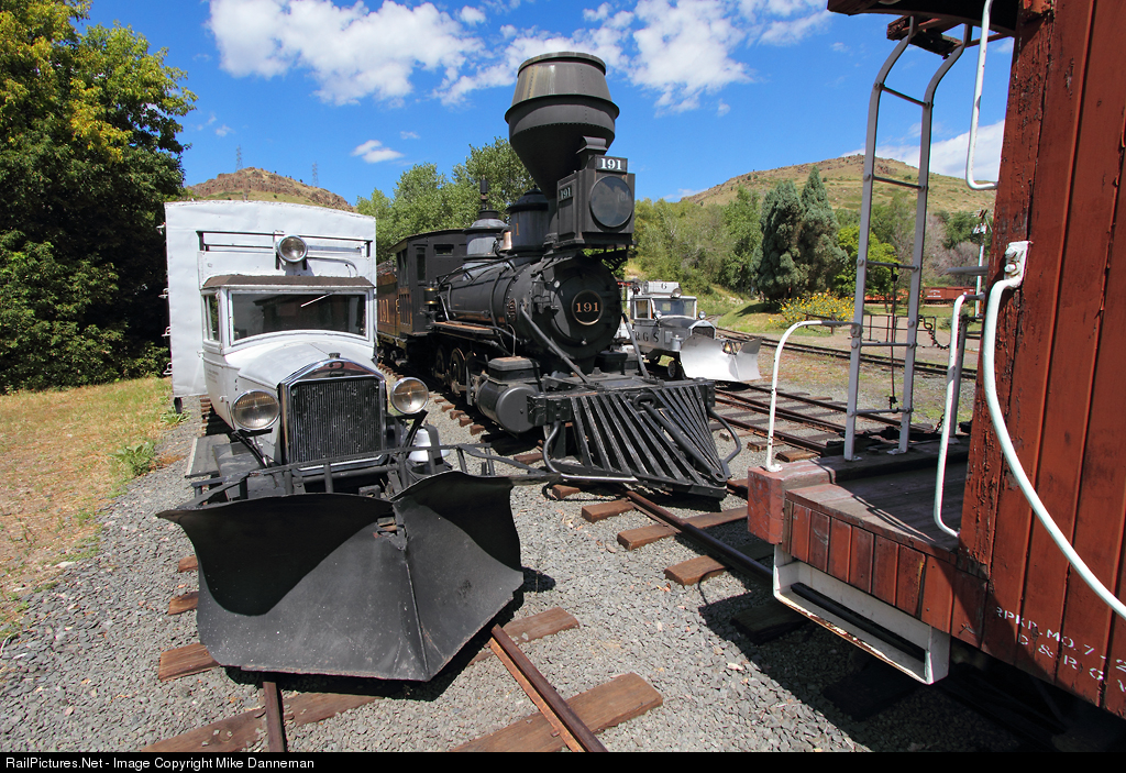 Six" four-door sedan, soon replaced in 1939 with a Pierce-Arrow body. These “Motors” were less expensive to operate than steam-powered trains and helped Rio Grande Southern continue to operate the mail contract for the small towns on its route. In the center is the oldest surviving steam locomotive in Colorado. Built in 1880 for the Denver, South Park & Pacific, the 2-8-0 was renumbered to No. 191 in 1885, later retaining that number when DSP&P went to the Denver, Leadville & Gunnison Railroad in 1889. The consolidation is cosmetically restored as it appeared on the DL&G before it went to the Colorado & Southern. On the right is another “Galloping Goose” from the RGS, No. 6, which was built in 1934 from a Buick body and equipped with a flatbed, and is and is considered a “work goose.” Framing the scene on the right is Rio Grande short caboose No. 0578.