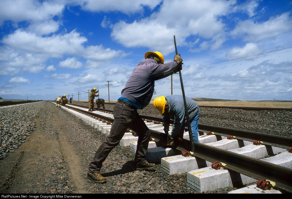 Occasionally, track laying still requires a human touch, such as these Union Pacific men adjusting Pandrol clips while putting down the third main line through between North Platte and Gibbon, Nebraska. This location is at milepost 278 west of West Keith on UP’s busy Kearney Subdivision, on May 8, 1995.