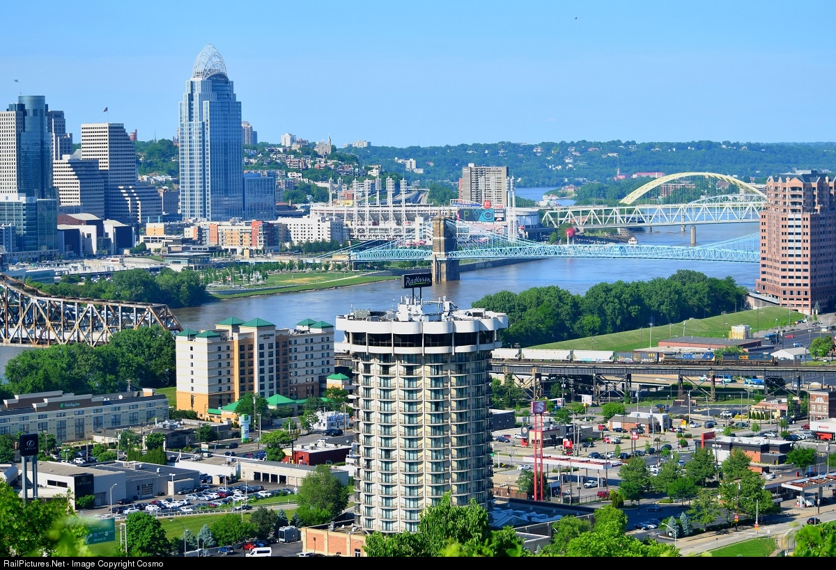 Q316-23 comes across the Ohio River on the C&O bridge with the Cicninnati Skyline in the Background.