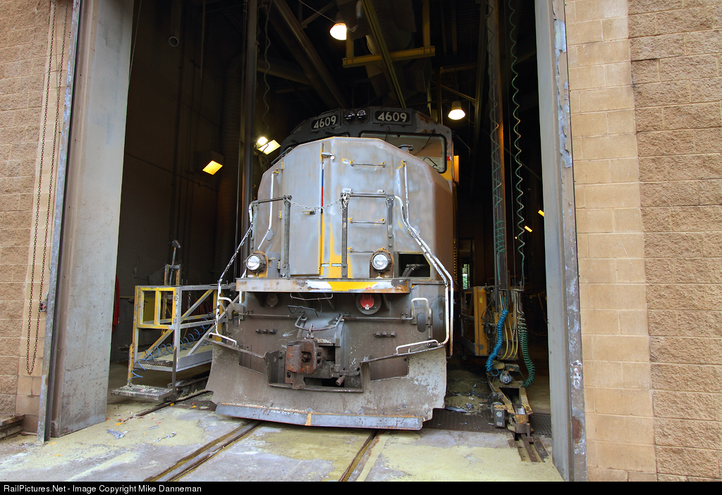 Union Pacific EMD SD70M No. 4609 gets “sandblasted” and cleaned during prepping for a new paint job in the paint shop at UP’s Downing B. Jenks Shop at North Little Rock, Arkansas, on May 18, 2015.
