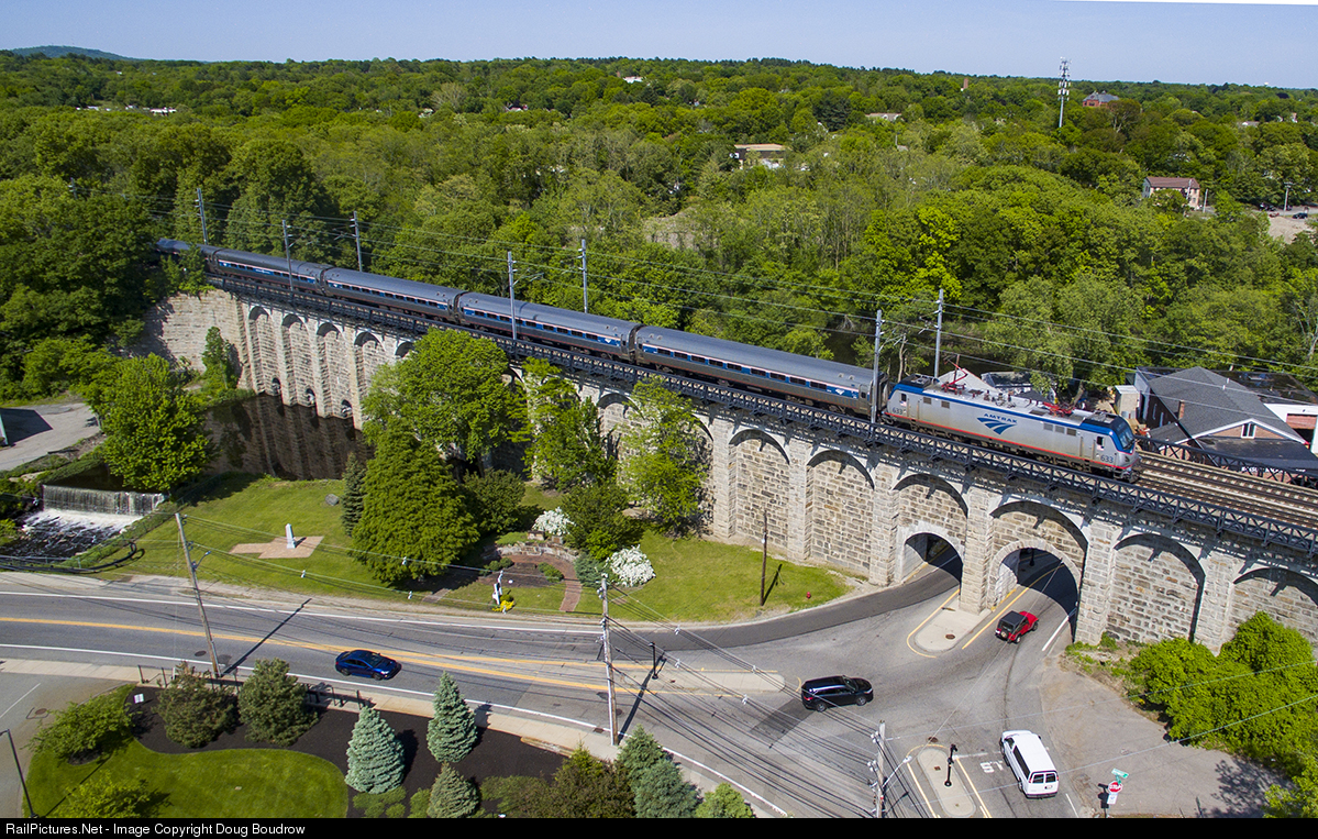 | The Canton Viaduct was completed in 1835 by the Boston & Providence Railroad. At the time, it was the largest viaduct in the world with a height of 70 feet and a length of 615 feet. It is the last surviving viaduct of its kind and has been in continuous service for 183 years. Amtrak train 175 rips over the viaduct at 120 mph on a nice Spring afternoon. |