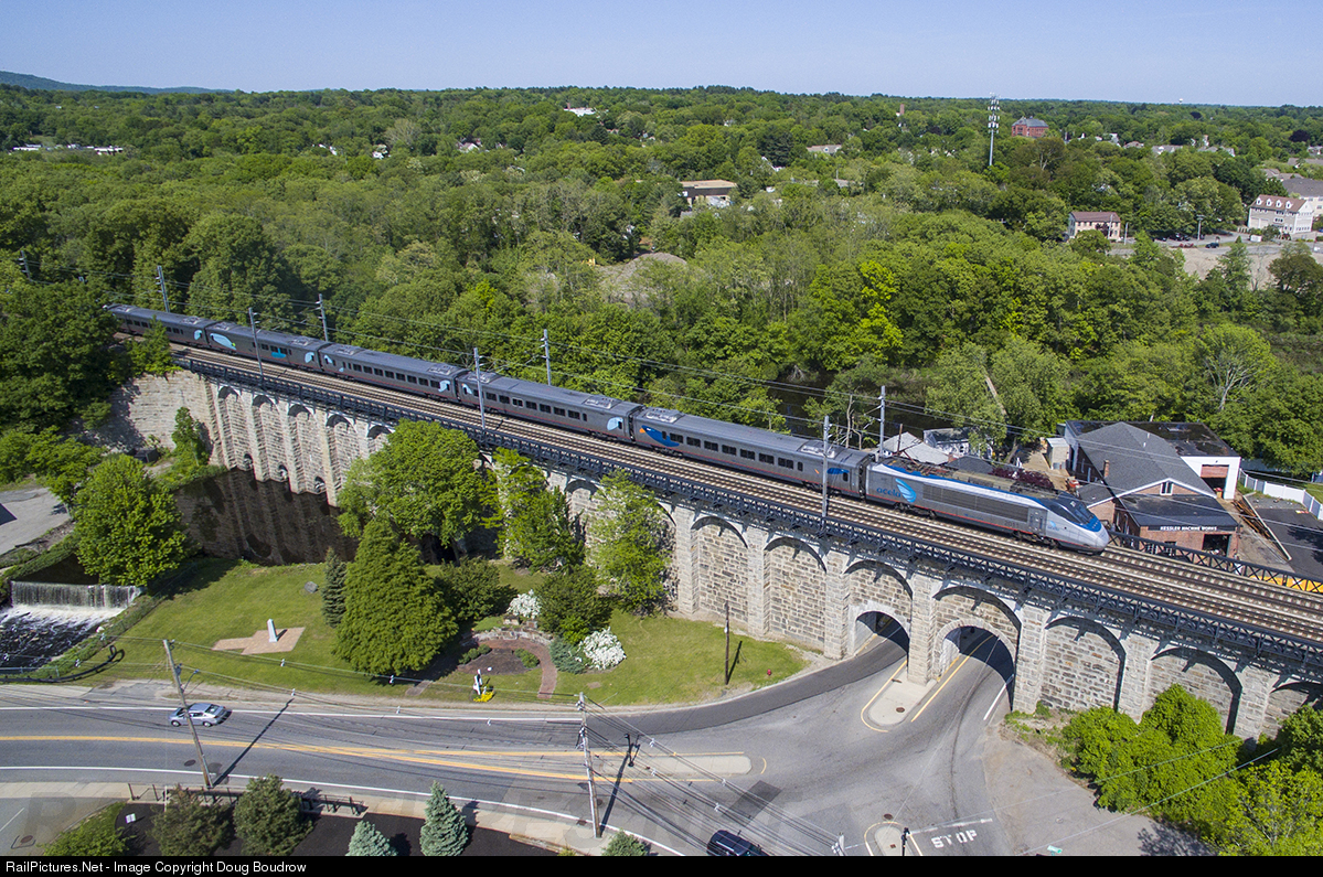 | The Canton Viaduct was completed in 1835 by the Boston & Providence Railroad. At the time, it was the largest viaduct in the world with a height of 70 feet and a length of 615 feet. It is the last surviving viaduct of its kind and has been in continuous service for 183 years. Amtrak Acela Express rips over the viaduct at 125 mph on a nice Spring afternoon. |