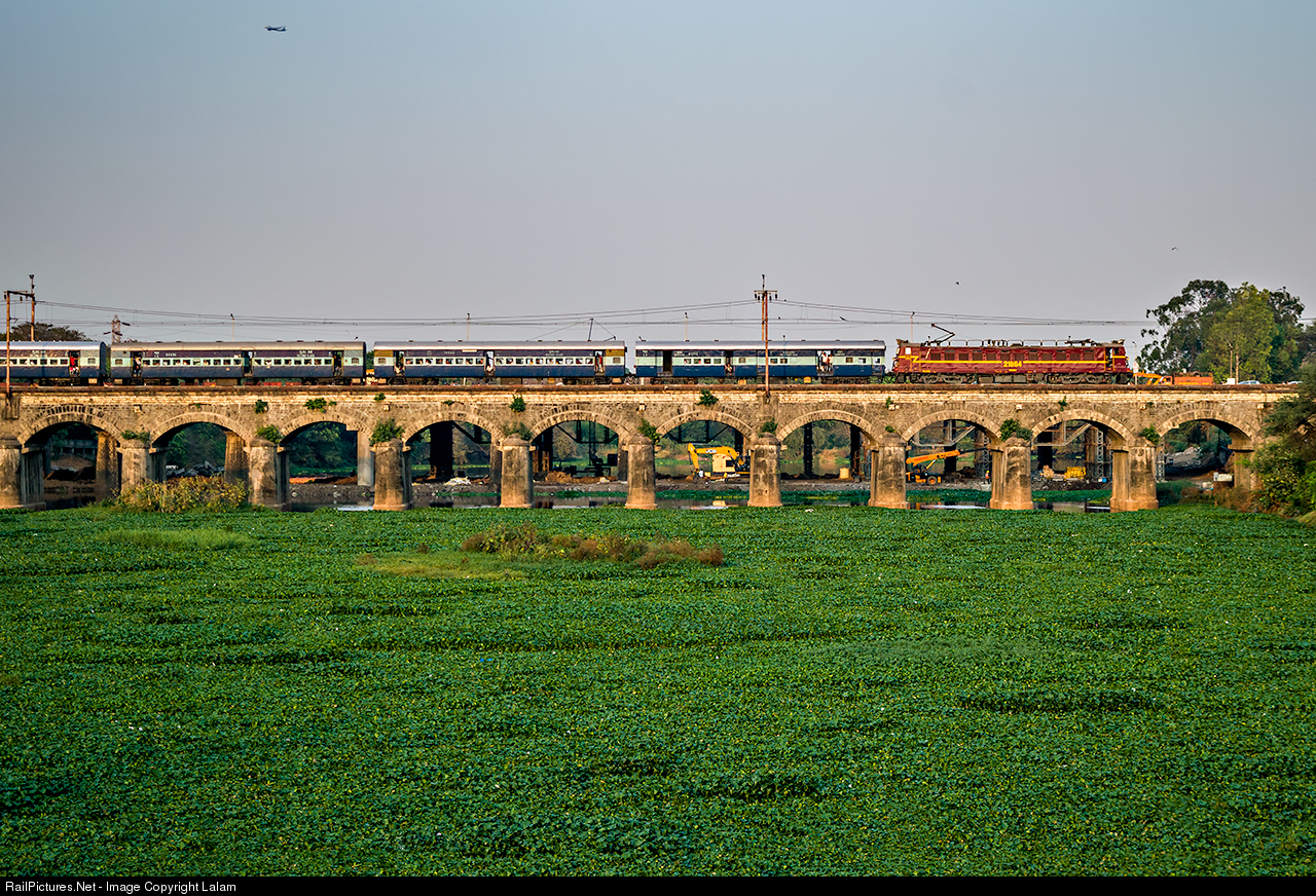 | 22 years old WCAM-2 locomotive leading Karjat to Pune passenger train over Dapodi viaduct. As every year during summer, Mula river has got a green coat of water hyacinth. A new road bridge is under construction behind the railway bridge. |