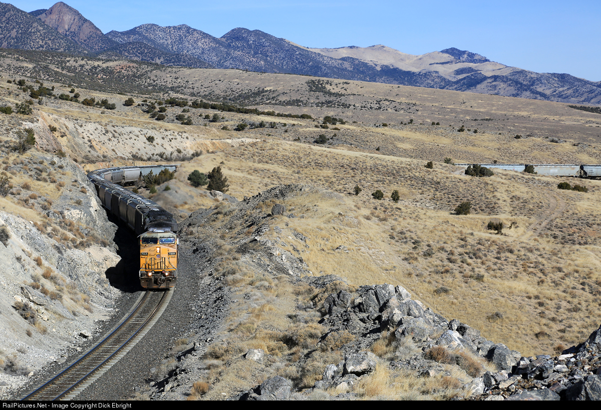| UP 7325 has rounded Arnolds Loop on the 1% climb to the summit of the Toano Range at Silver Zone Pass. I believe this is a grain train but it could be Soda Ash or another bulk commodity. Summit is around 4 miles ahead and then it is downhill to Shafter followed by another climb to Hogan Tunnel in the Pequop Range. |