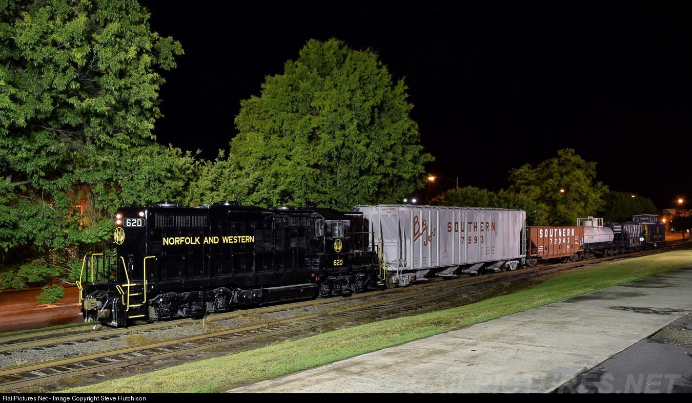| Looking like a new HO scale model right out of the box, recently painted N&W GP9 620, poses with restored freight cars for a night photo shoot at the North Carolina Transportation Museum. 620 was repainted into this classic paint scheme just in time for the N&W Historical Society convention at the historic Spencer Shops. |
