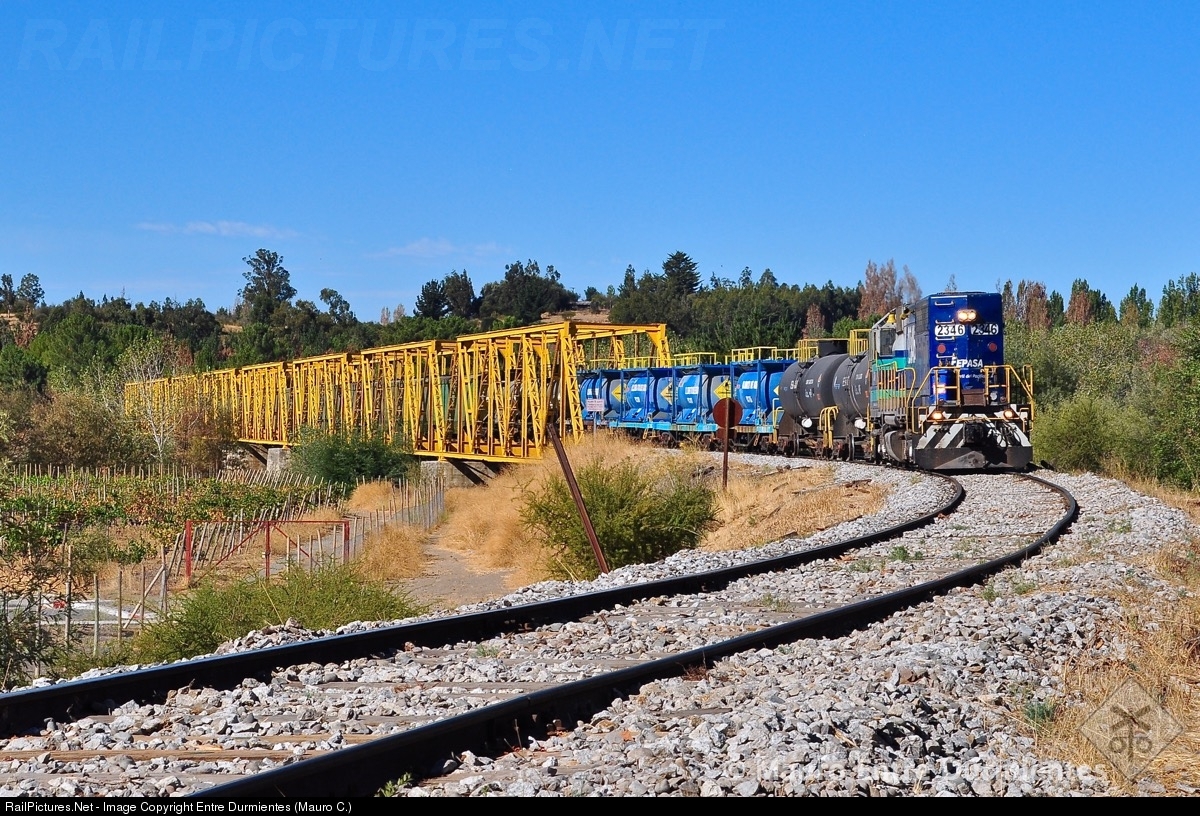 Long bridge over the Itata river, in the last section of the railway branch Rucapequen - Nueva Aldea, is crossed by freight train 50.090 of FEPASA railroad with destination Arauco cellulose plant in Nueva Aldea town, distant 1 mile from this location. The locomotive is a EMD SDL39, former Milwaukee Road, SOO line, and Wisconsin Central (lightweight and experimental version of the SD39, but uses a GP38's body and frame with the SD39's engine), unit D-2346 now working in Chile.