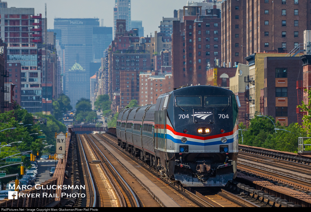 First in, first out. 704 (P32AC-DM, Phase III) would be the first engine to arrive and so was also the first to depart MTA Metro-North Railroad Grand Central Terminal with an Amtrak train as 281 headed north towards Niagara Falls, NY. The scene is a classic, with the “NY 4” marker on the Park Avenue Viaduct and Met Life Building in the background. As of now you only have the summer to catch these trains, so get out and shoot and ride!