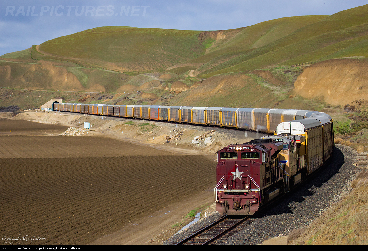 | Exiting Tunnel 5 1/2 on its approach to King City, UP 1988 leads an El Paso, Texas-bound empty auto train down the ex-Southern Pacific coast line on a perfectly clear morning. |