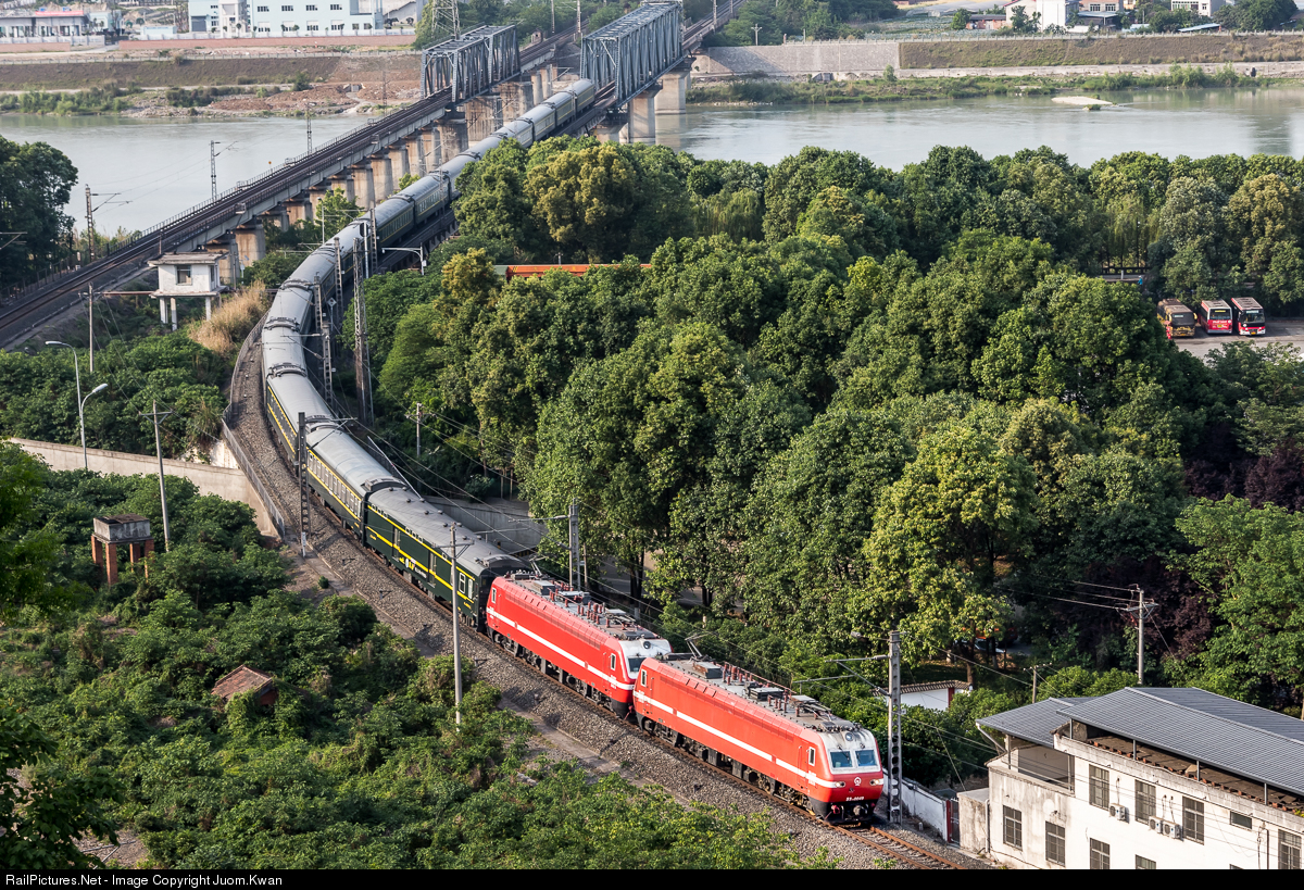 | Double SS7E electric locomotive traction fast passenger train, through the Baocheng railway Fushui bridge. |