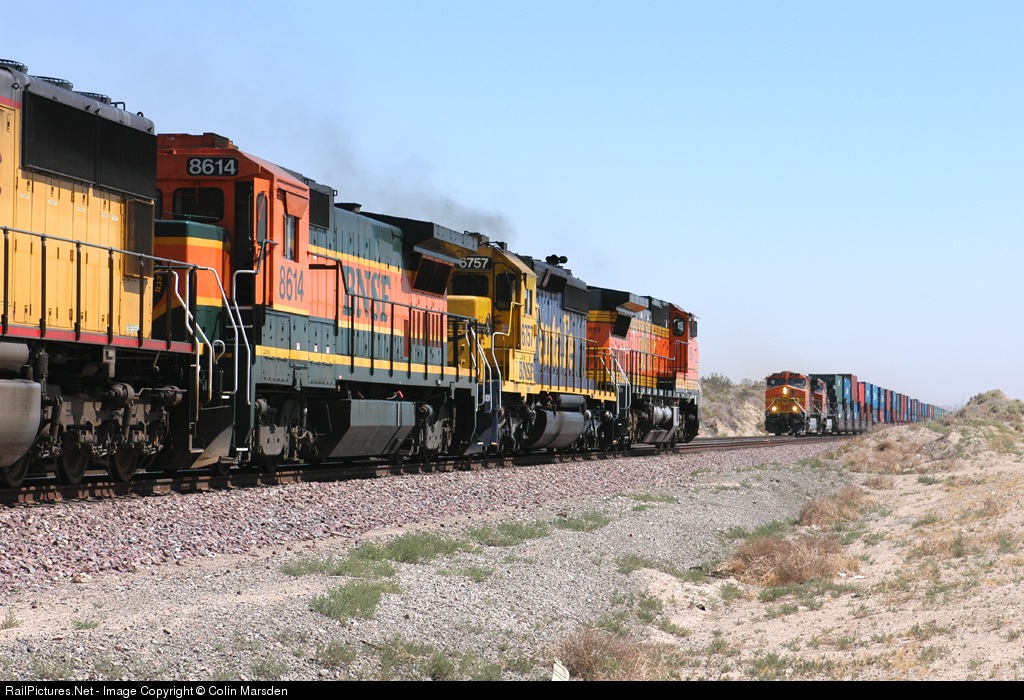 | Meet at Robinson Road. BNSF859, SF6757, BNSF8614, UP4274 head west, while BNSF4339 head east with a stack train. 14.55Hrs |