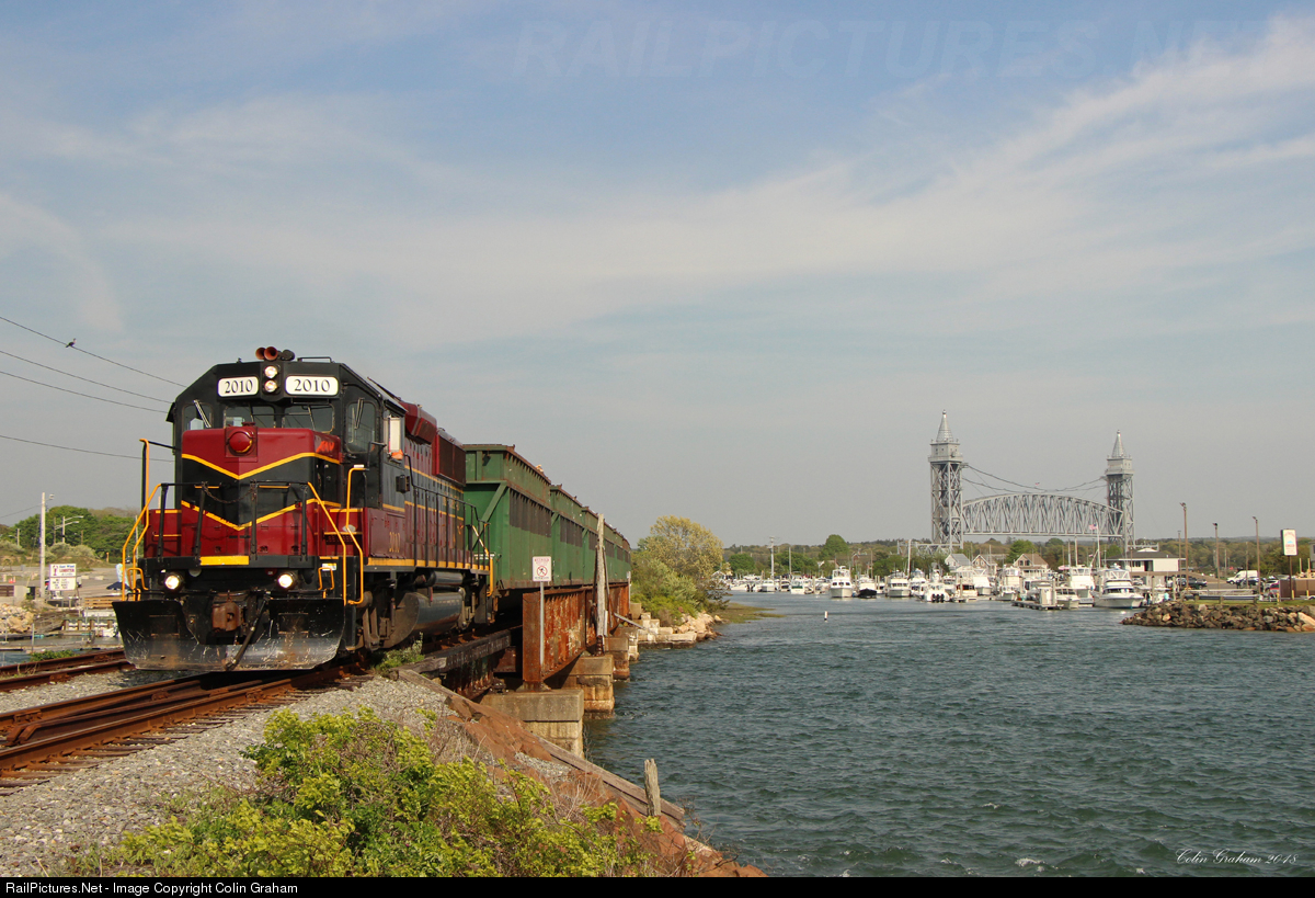 | Mass Coastal 2010, an ex-Chicago & Northwestern GP50 leads a short loaded trash train (referred to down here as the Energy Train) northbound into Wareham. The iconic Cape Cod Canal Railroad Bridge can be seen ascending in the distance. |